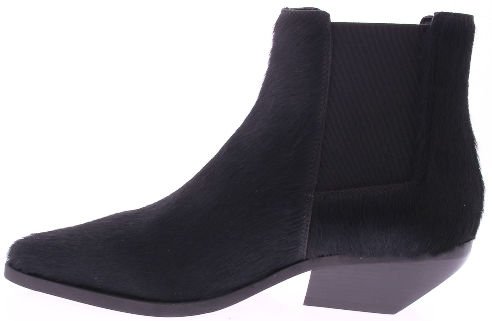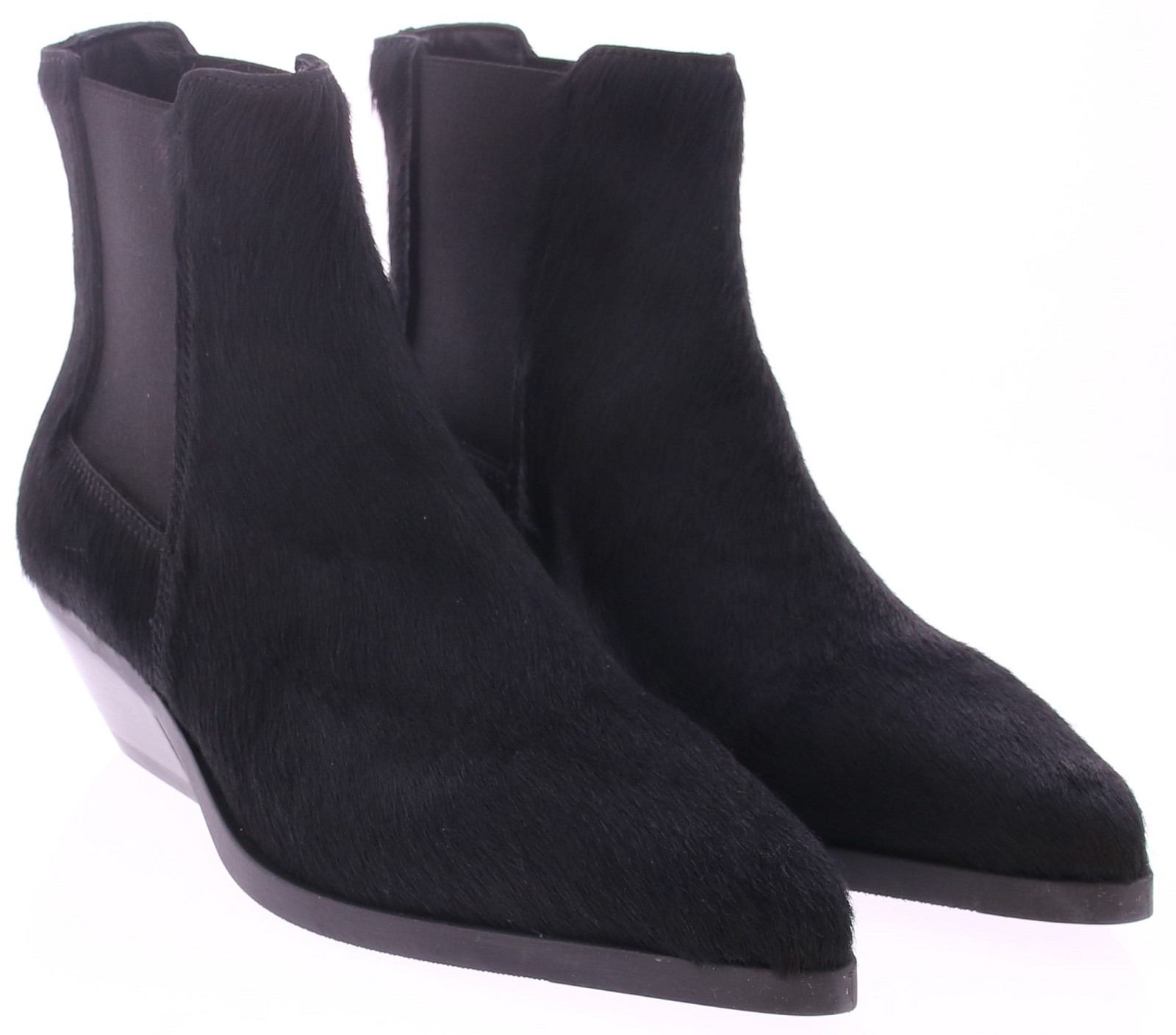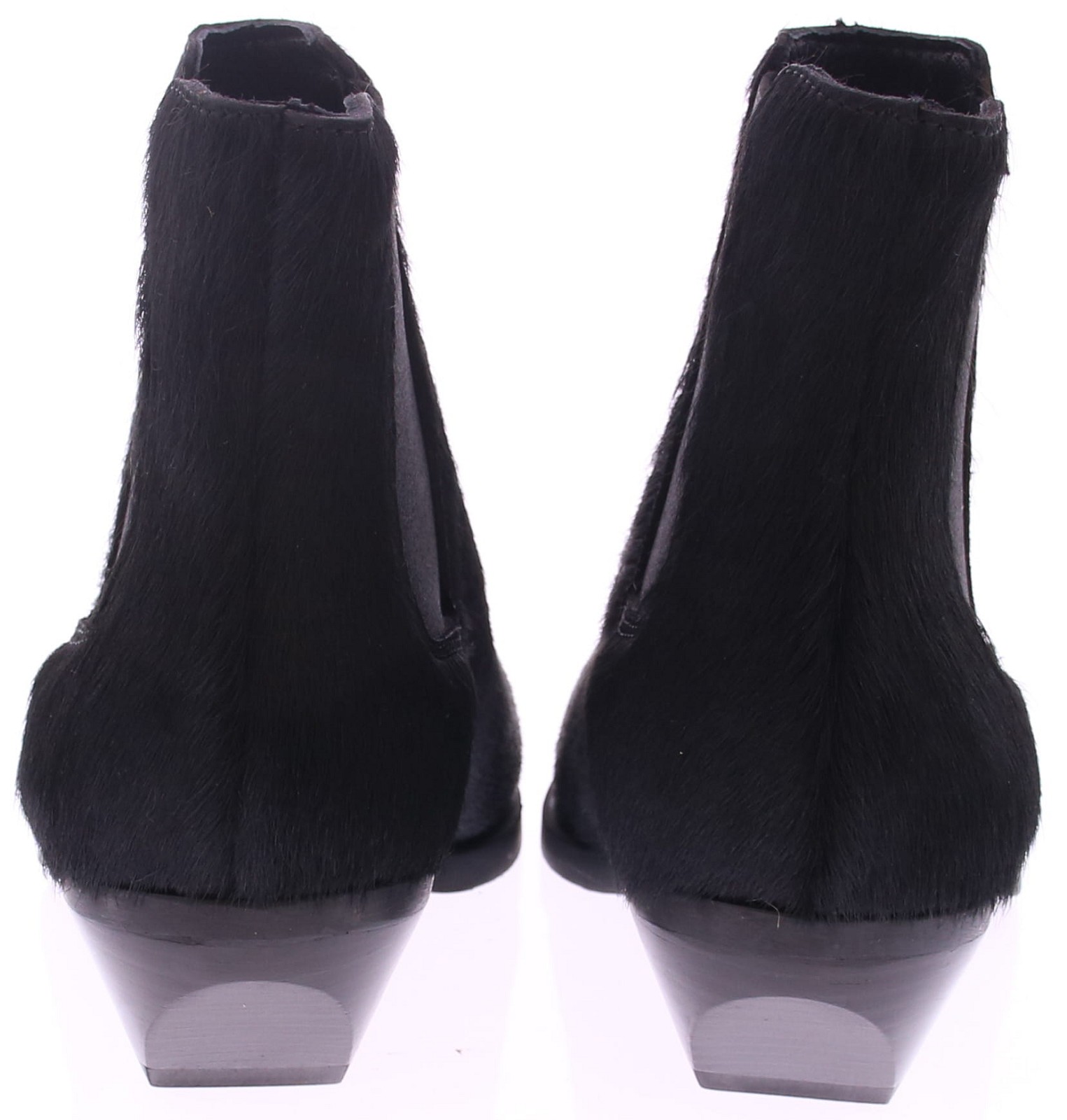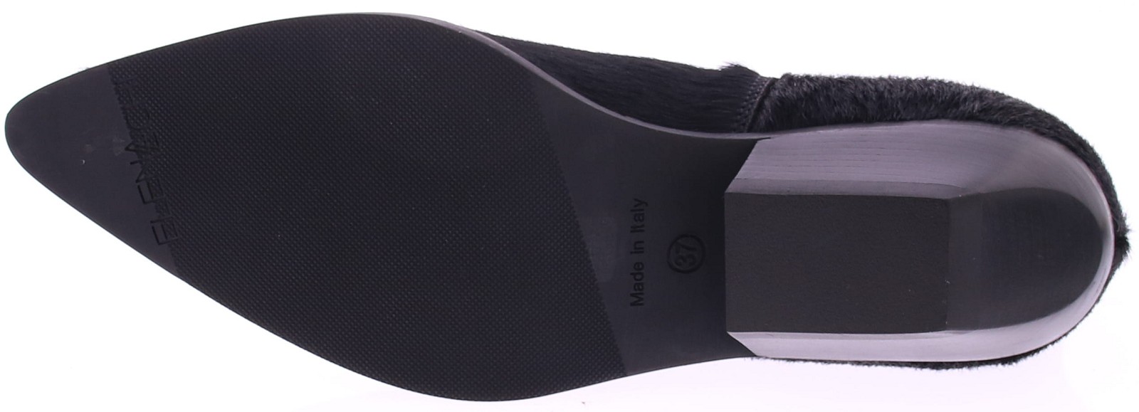 Zwart pony hair dames enkelboot van Elena Iachi. Het laarsje is uitgevoerd in zwart ponyhair, wat zorgt voor een, levendige textuur en een unieke uitstraling. De licht carré neus geeft de schoen een moderne en verfijnde vorm, terwijl de schuin geplaatste hak van 5 cm niet alleen voor een vrouwelijke touch zorgt, maar ook comfortabel loopt. Aan de zijkant is een elastisch inzetstuk verwerkt, wat samen met het ritsje aan de binnenkant zorgt voor een makkelijke instap en een fijne pasvorm. Dit laarsje combineert moeiteloos stoer en elegant en laat zich perfect dragen onder een jeans, rok of jurk.