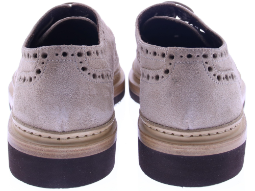 De Fabrizio Silenzi brogue 4147 in licht zandkleurig suède is een schitterende interpretatie van de klassieke Engelse brogue, vervaardigd met Italiaans meesterschap. De decoratieve perforaties zijn volledig authentiek geperforeerd, precies zoals bij de oorspronkelijke jachtschoenen die dienden om water uit de schoen te laten lopen. Dit eerbetoon aan het traditionele ontwerp combineert historie met hedendaagse elegantie. Het zachte suède in een verfijnde zandtint geeft de schoen een lichte, zomerse uitstraling, terwijl de leren doorgestikte stormrand rondom het bovenwerk zorgt voor een robuuste en duurzame afwerking. De stevige zool biedt stabiliteit en comfort, waardoor deze brogue niet alleen stijlvol oogt, maar ook bijzonder prettig draagt. De Fabrizio Silenzi 4147 in licht zand suède is de perfecte keuze voor de man die houdt van klasse, traditie en kwaliteit. Een schoen die moeiteloos past bij zowel formele als casual kleding, en altijd een vleugje tijdloze elegantie toevoegt aan iedere outfit.