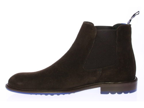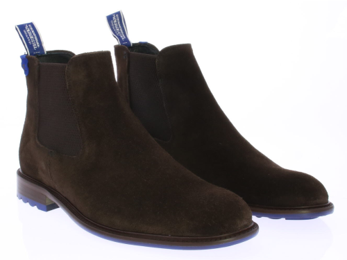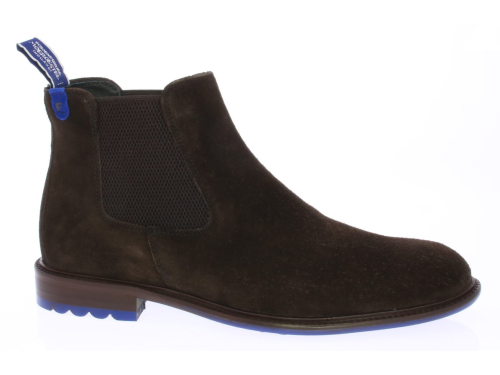 Heren Chelsea boot van Floris van Bommel van donkerbruin suede met blauwe accenten op de hiel en de zool. De wijdte is H en het voetbed is uitneembaar.