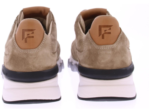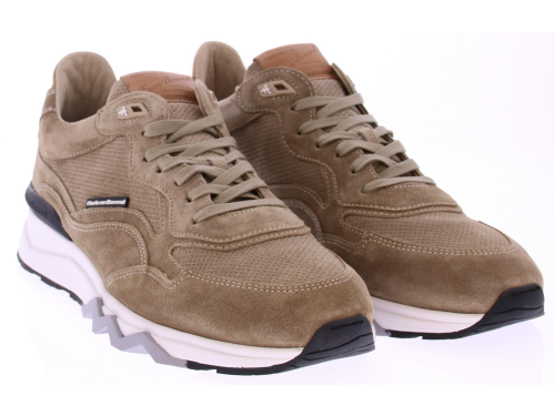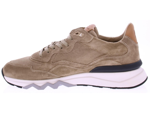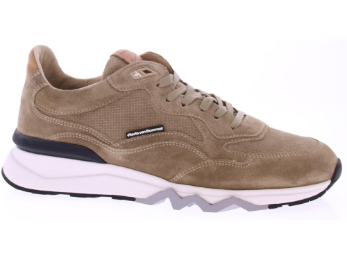 Beige suede heren sneaker van Floris van Bommel.DE ZAGER 02.23 De sneaker heeft een rubberen zool en cognac-kleurige leren accenten op de tong en hiel. Het loopvlak is voorzien van een typische Floris van Bommel zigzaglijn. De schoen komt op een G1/2-leest. De binnenzool is uitneembaar en de voering is leer.