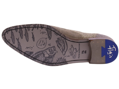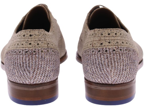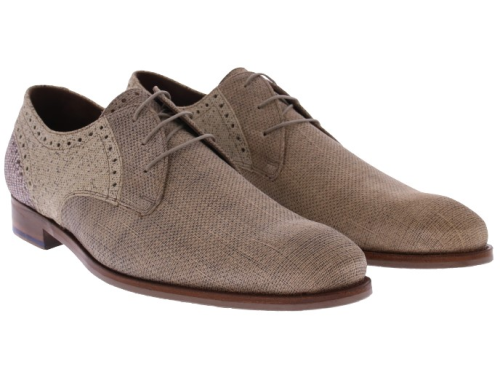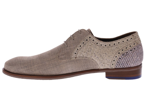Beige leren heren veterschoen van Floris van Bommel.DE STAPPER 17.93 Het suede heeft een canvasprint met op de hiel een wolprint. De voering is van leer en de zool van rubber. Deze schoen is gemaakt in een G1/2-leest.