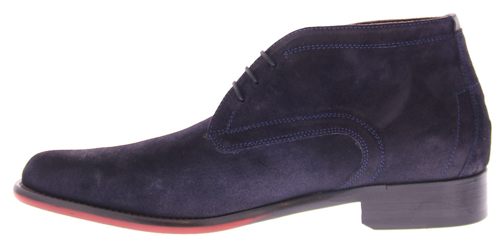Heren veterboot van Floris Van Bommel uitgevoerd in donker blauw suede op een spotieve rode rubber onderwerk. artikel De draver 01.00 .De schoen is gemaakt in breedte H en heeft een leren voering.