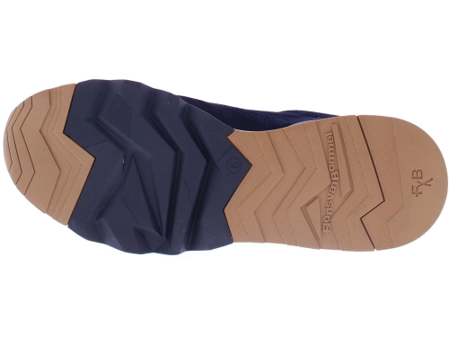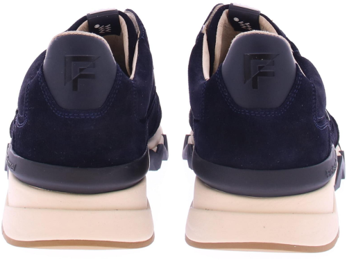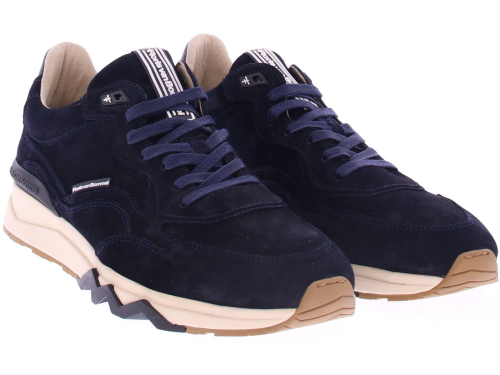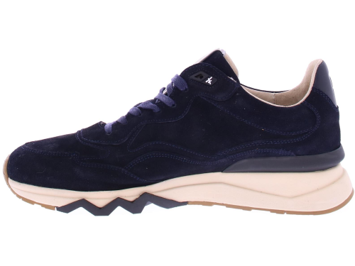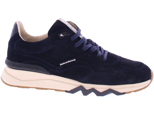 Donkerblauwe suede heren sneaker van Floris van Bommel: De Zager 02.03. Deze sneaker is uitgevoerd op een rubberen zool. Het loopvlak is voorzien van een typische Floris van Bommel zigzaglijn. De schoen komt op een G1/2-leest. De binnenzool is uitneembaar en de voering is van leer.