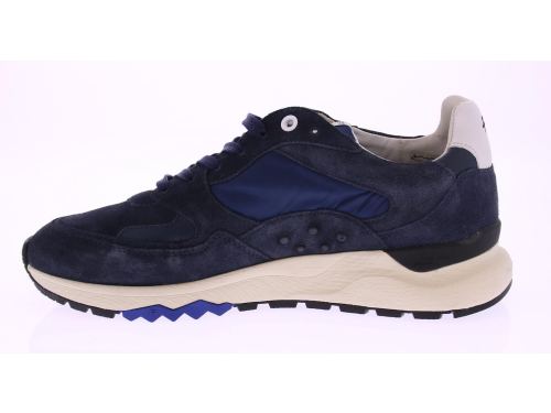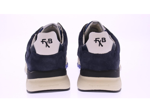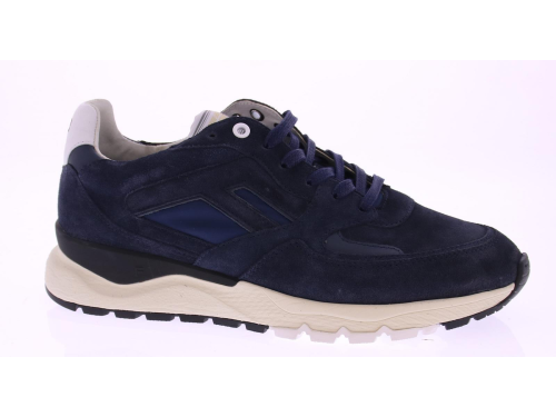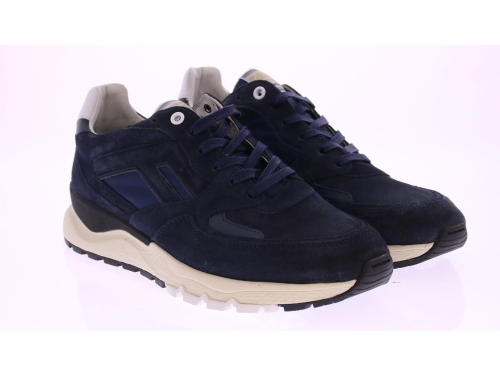 Heren sneaker van Floris van Bommel artikel SFM-10154-41-01 model de Treener 01.12. Deze donkerblauwe sneaker heeft een bovenwerk van suède met stof en leer. De tussenzool is donkerblauw en het loopvlak van zwart met wit en rubber. De voering van de schoen is geheel van leer met een los uitneembaar voetbed. De breedte van de leest is G1/2.