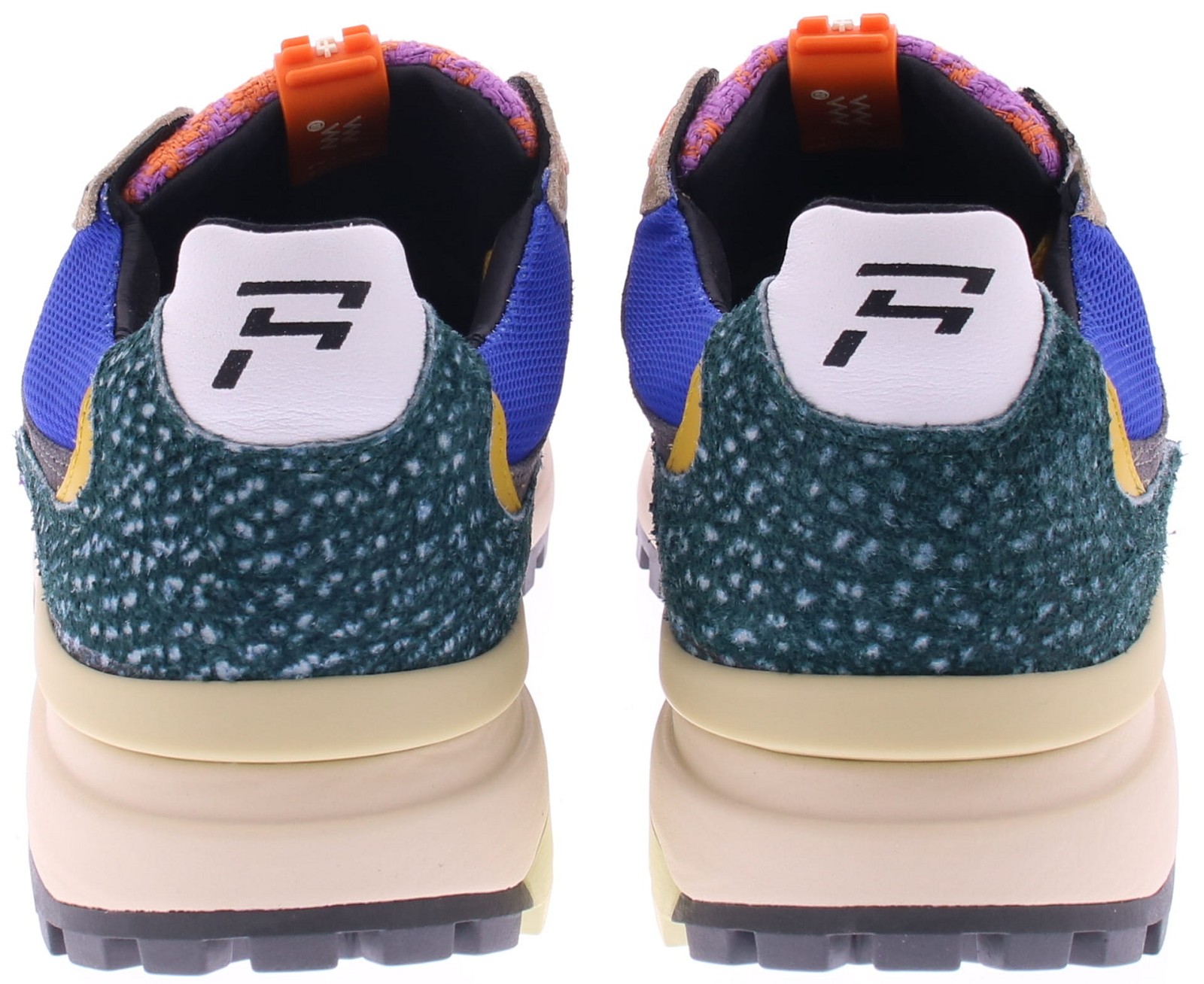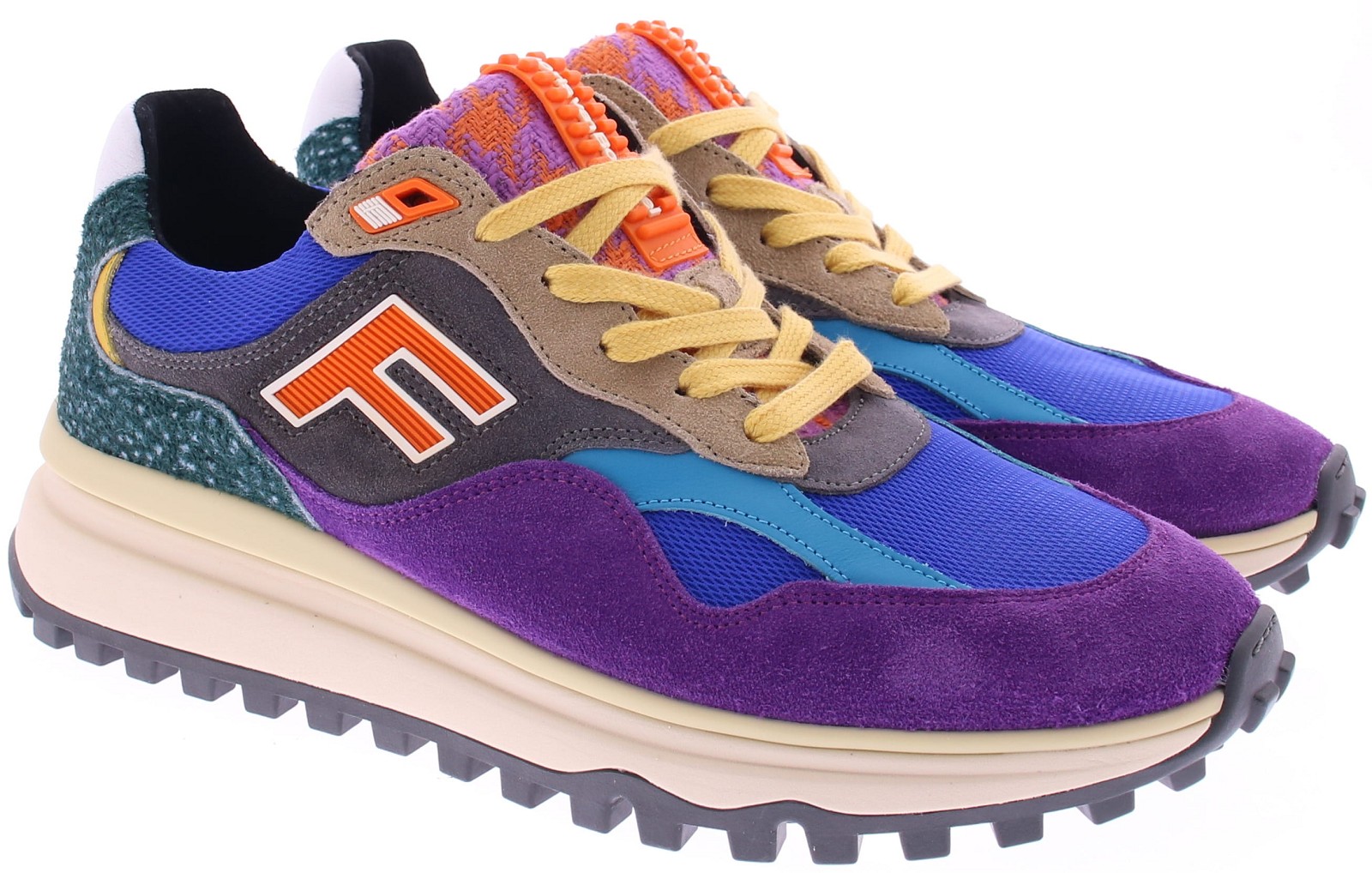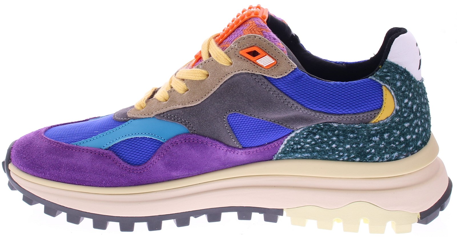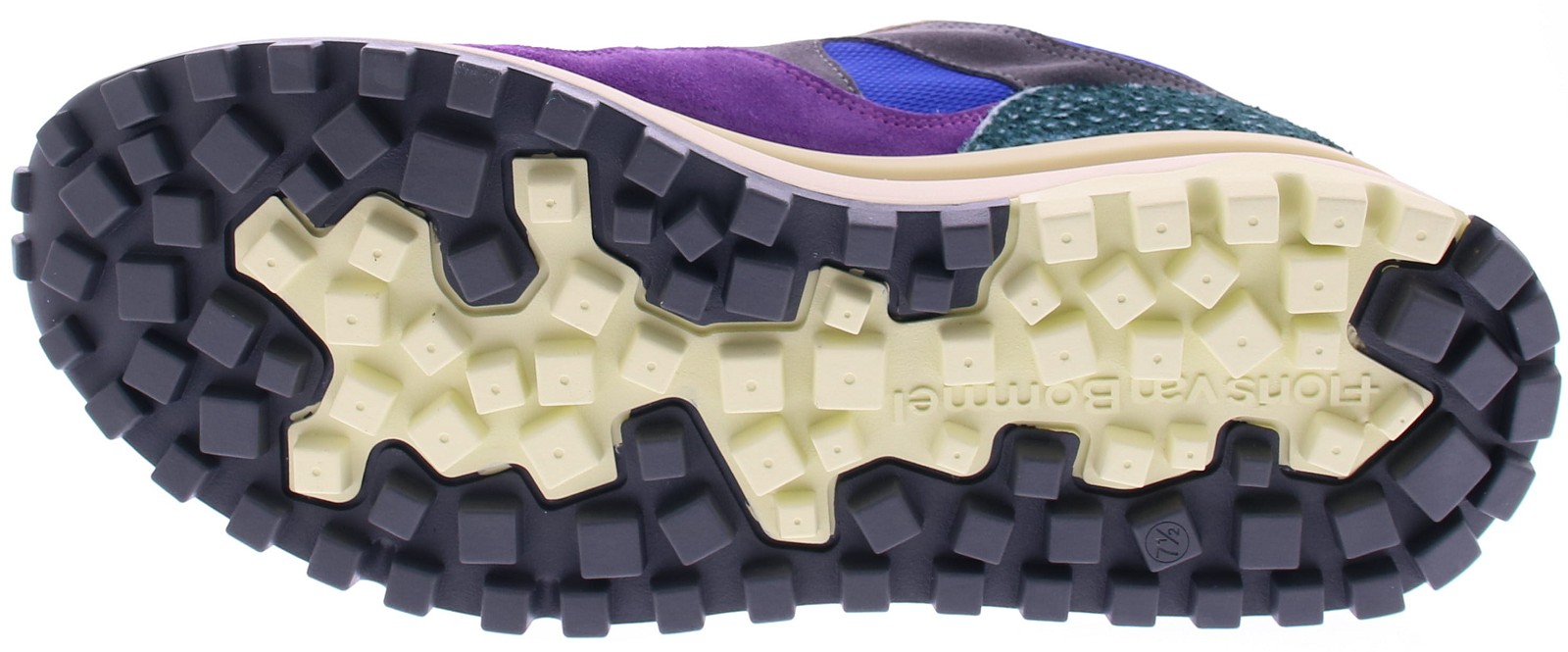 Op zoek naar een sneaker met lef? De Floris van Bommel De Gripper 05.01 is een opvallende eyecatcher die streetstyle en vakmanschap moeiteloos combineert. Uitgevoerd op de comfortabele G½-leest biedt deze schoen een perfecte pasvorm voor de gemiddelde tot iets bredere voet. Deze sneaker barst van de unieke details: een mix van hoogwaardige materialen zoals suède, mesh en leer in sprekende kleuren zoals paars, blauw en oranje. De robuuste zool met grof profiel geeft niet alleen extra grip, maar maakt de look ook compleet. De oranje accenten en het kenmerkende ‘F’-logo zorgen voor die onmiskenbare Floris van Bommel flair.