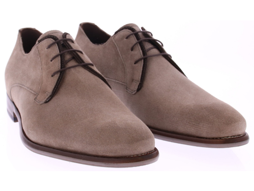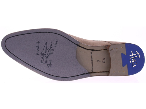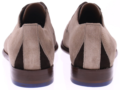 De Floris van Bommel De Stapper 66.01 is een elegante derby-veterschoen in zacht taupekleurig suède. Deze nette schoen heeft een slanke leest en een subtiele zool met een blauwe rubberen loopzool, typisch Floris van Bommel. Het ontwerp is strak en modern, met verfijnde stiknaden en een contrasterende hielinzet in donkerbruin. Perfect voor formele gelegenheden of een smart casual look. De Stapper 66.01 combineert comfort met klasse en is ideaal te dragen onder een chino, pak of stijlvolle jeans.