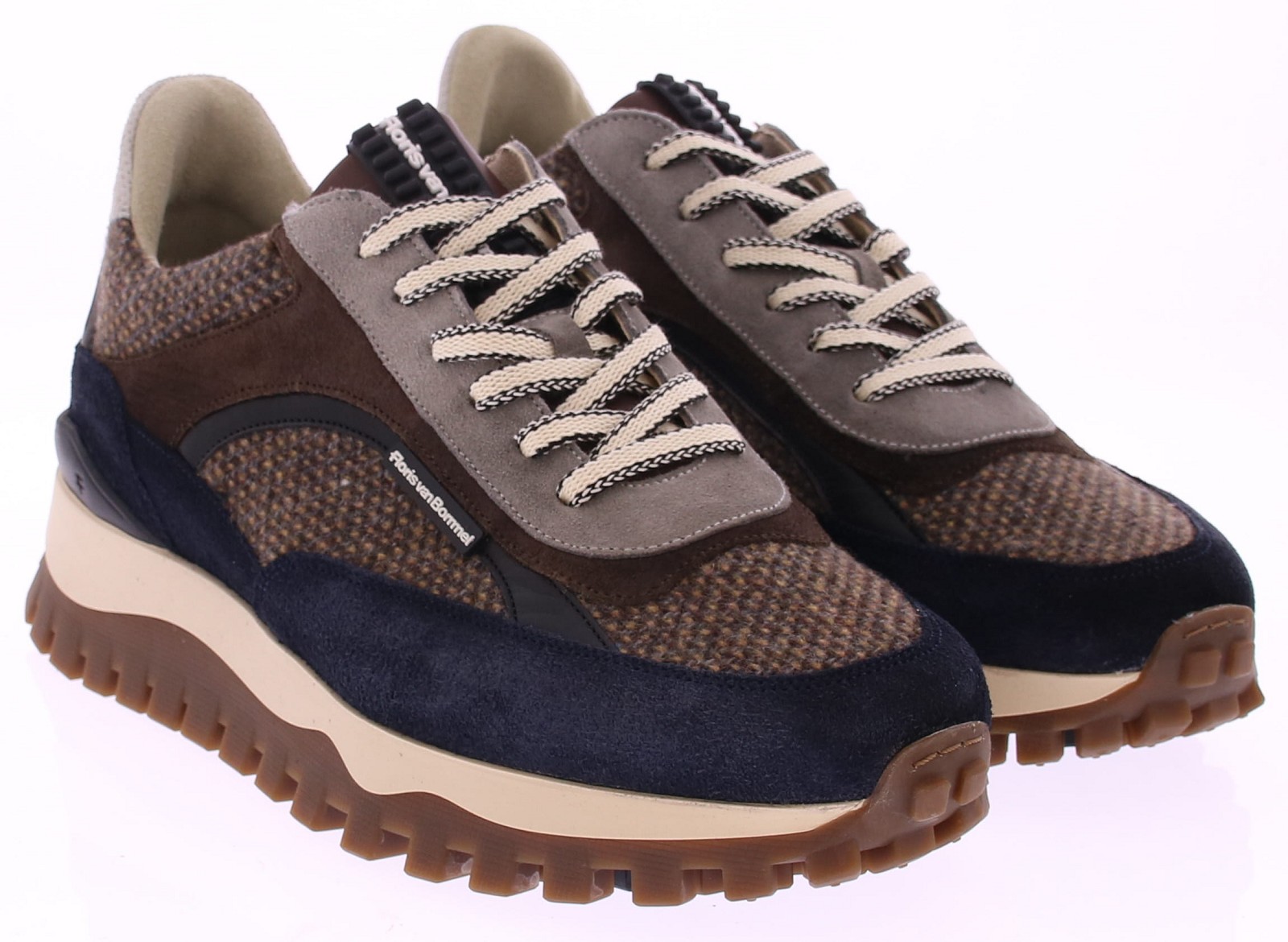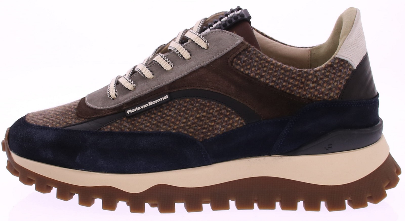 Floris van Bommel De Grommer 05.10 Bruin/blauwe Sneaker. Ontdek de perfecte mix van comfort en karakter met de Floris van Bommel De Grommer 05.10. Deze stijlvolle sneaker combineert een grove profielzool met een luxe bovenwerk van blauw suède, bruin textiel en olijfgroene accenten. De opvallende mix van materialen geeft de schoen een moderne, casual uitstraling met een knipoog naar outdoor. Dankzij het geweven textiel en de warme kleuren is deze schoen ideaal voor het najaar, maar met zijn ademende voering ook perfect voor het hele jaar door. De robuuste zool met bruin loopvlak zorgt voor uitstekende grip en comfort, of je nu de stad in gaat of een wandeling maakt.