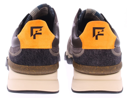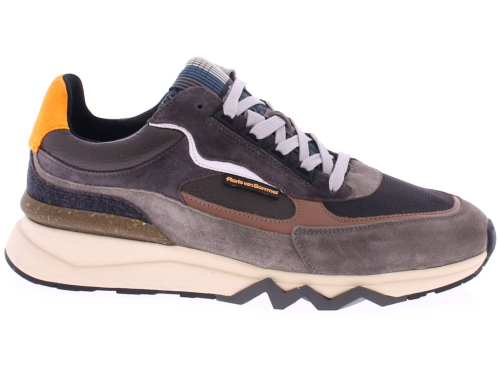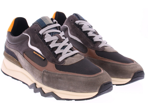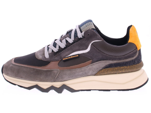 De Zager 10.07 van Floris van Bommel is een opvallende herensneaker die moeiteloos stijl en comfort combineert. Deze sneaker is uitgevoerd in een mix van hoogwaardige materialen zoals suède, leer en mesh, wat zorgt voor een rijke, gelaagde look. De kleurencombinatie van grijs, bruin en zwart wordt geaccentueerd door een oranje detail op de hiel, wat zorgt voor een eigentijds en speels contrast.