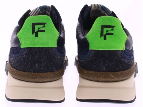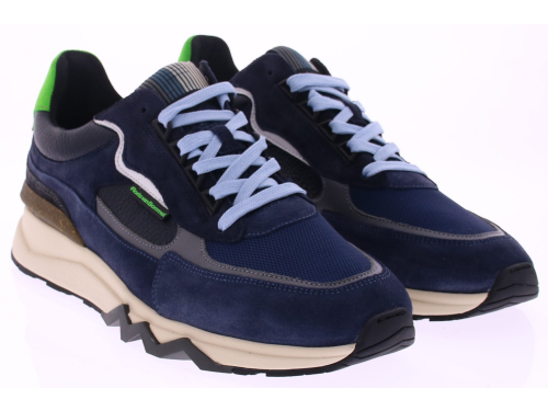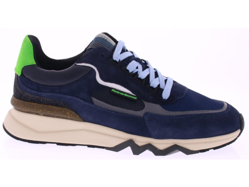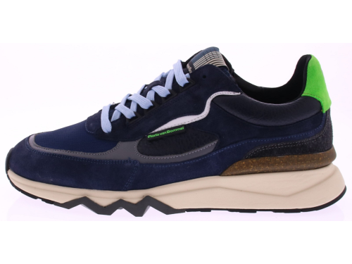 De Floris van Bommel De Zager 12.06 Sneaker Blauw/Zwart is een opvallende herensneaker met een stoere uitstraling. Deze uitvoering is rijk aan contrasten dankzij de combinatie van diepblauw suède, zwart leer en mesh accenten. De neon groene hielpatch en subtiele limegroene merkdetails zorgen voor een frisse, sportieve touch. Deze sneaker is gebouwd op de herkenbare chunky zool van Floris van Bommel, voorzien van een opvallend zaagtandprofiel voor een robuuste uitstraling en uitstekende grip. De off-white zool vormt een mooi contrast met het donkere bovenwerk en geeft de schoen een modern silhouet. Ideaal voor wie houdt van een sportieve, maar stijlvolle look.