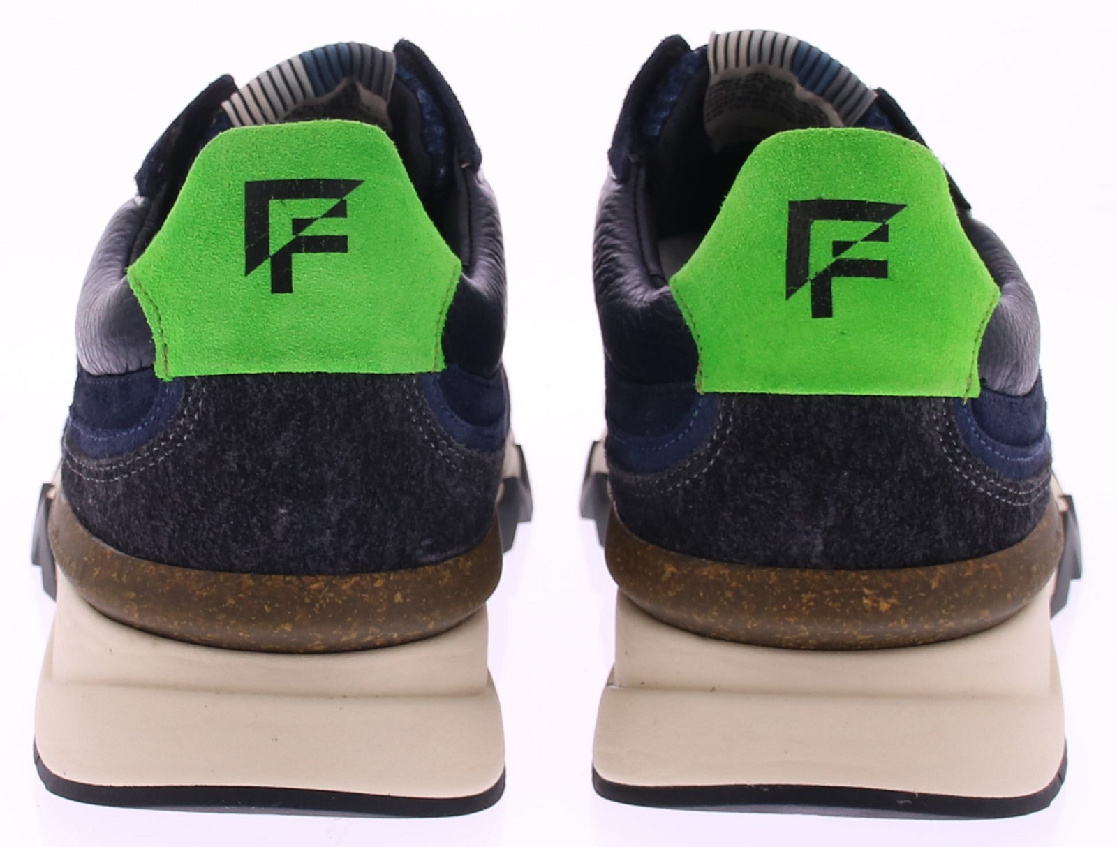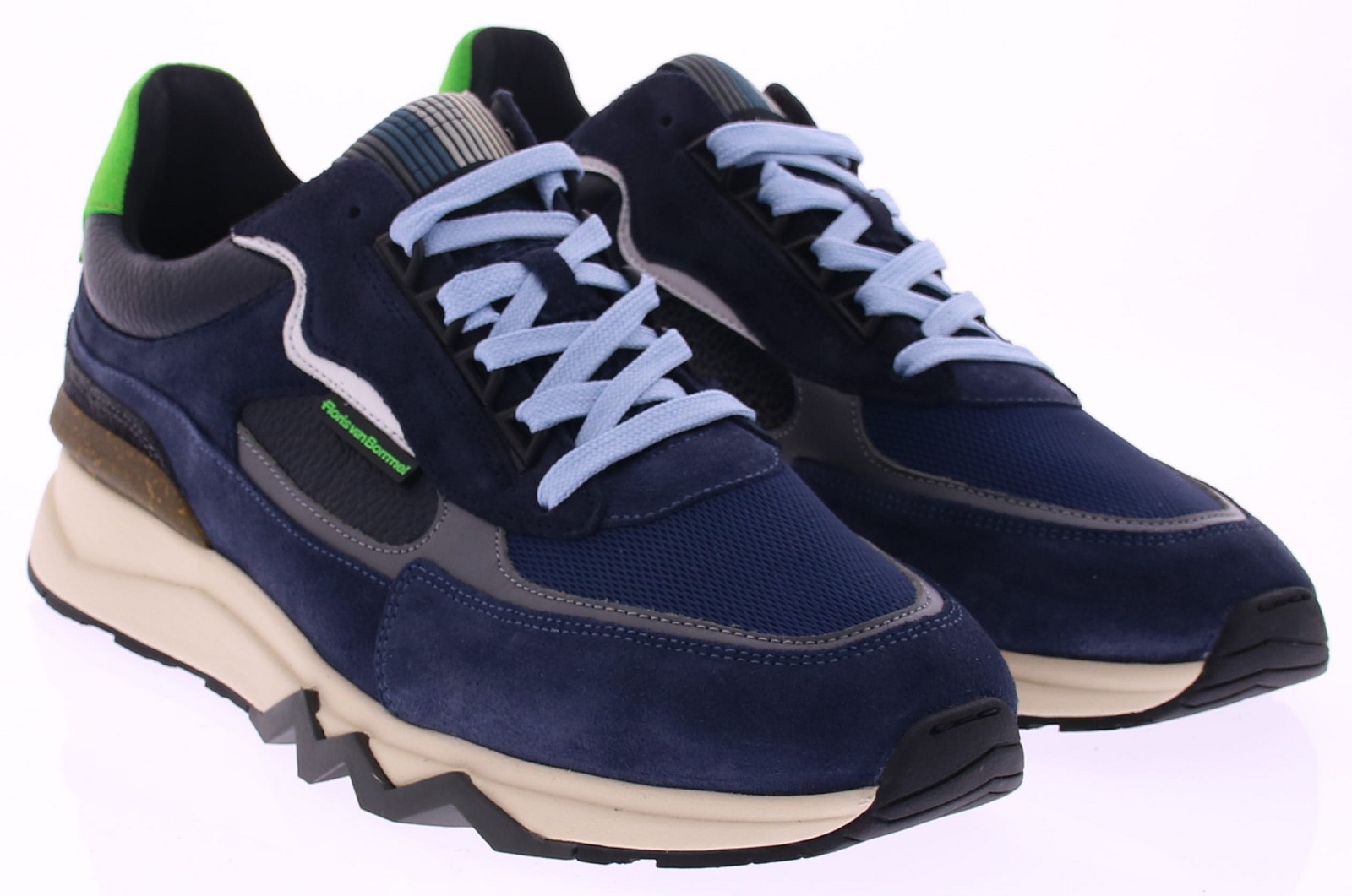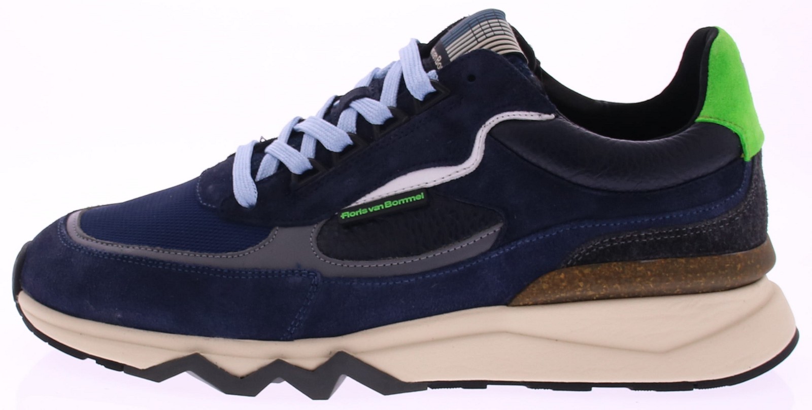 De Floris van Bommel De Zager 12.06 Sneaker Blauw/Zwart is een opvallende herensneaker met een stoere uitstraling. Deze uitvoering is rijk aan contrasten dankzij de combinatie van diepblauw suède, zwart leer en mesh accenten. De neon groene hielpatch en subtiele limegroene merkdetails zorgen voor een frisse, sportieve touch. Deze sneaker is gebouwd op de herkenbare chunky zool van Floris van Bommel, voorzien van een opvallend zaagtandprofiel voor een robuuste uitstraling en uitstekende grip. De off-white zool vormt een mooi contrast met het donkere bovenwerk en geeft de schoen een modern silhouet. Ideaal voor wie houdt van een sportieve, maar stijlvolle look.
