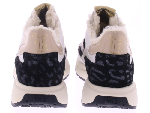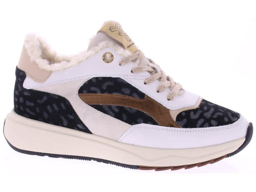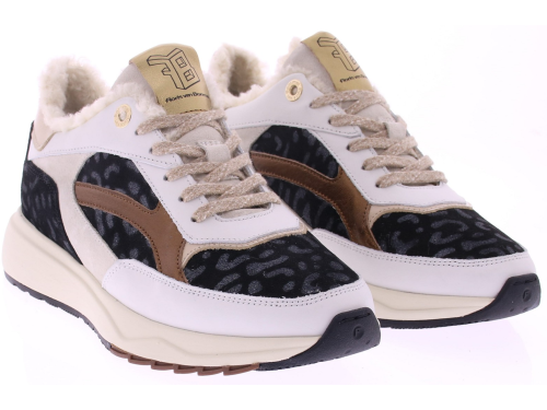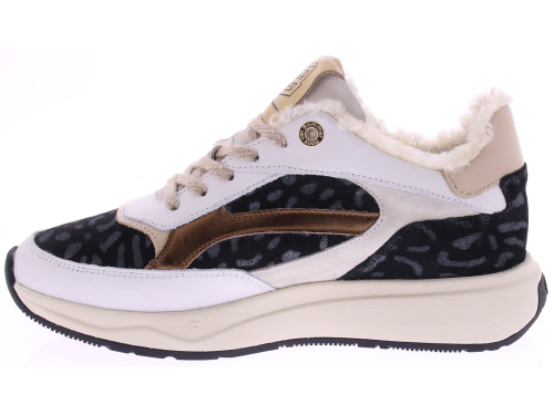 Wit leer met zwart bewerkt suède damessneaker van Floris van Bommel. Model Suvi 02.10. Deze sneaker is uitgevoerd in de kleur wit met zwarte vlakken in bewerkt suede, met in de schoen een klein bontrandje. De sneaker heeft een lichtgewicht zool met een slijtvast TPU loopvlak die niet alleen zorgt voor een trendy uitstraling, maar ook voor goede grip en stabiliteit tijdens het dragen. Het voetbed van de sneaker is uitneembaar, waardoor je de mogelijkheid hebt om je eigen inlegzolen te gebruiken. De breedte van de schoen is G.