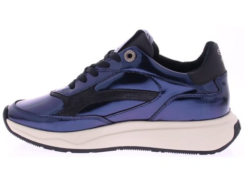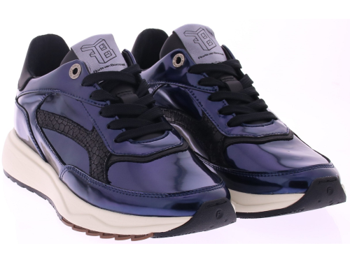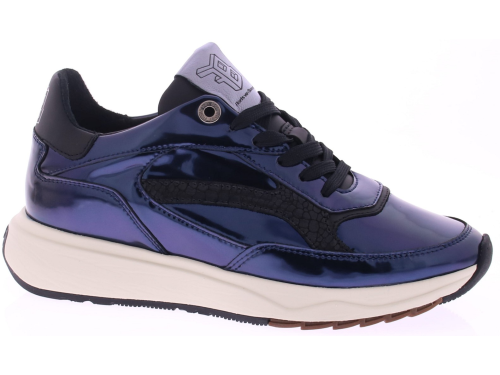 Donkerblauw poetsleren met zwarte accenten dames sneaker van Floris van Bommel. Model Suvi 02.09. Deze sneaker is uitgevoerd in de kleur blauw. De sneaker heeft een lichtgewicht zool met een slijtvast TPU loopvlak die niet alleen zorgt voor een trendy uitstraling, maar ook voor goede grip en stabiliteit tijdens het dragen. Het voetbed van de sneaker is uitneembaar, waardoor je de mogelijkheid hebt om je eigen inlegzolen te gebruiken. De breedte van de schoen is G.
