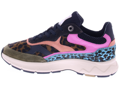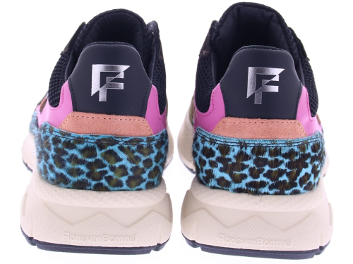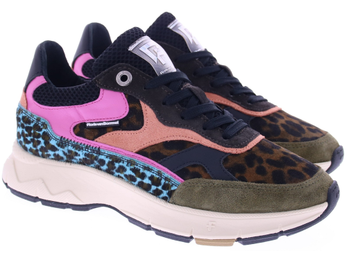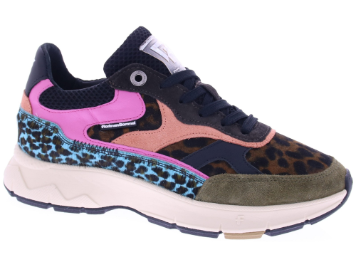 Durf op te vallen met deze unieke Floris van Bommel dames sneaker Model 03.12 Daysi brown ! Een gedurfde mix van kleuren, materialen en prints maakt dit model een absolute eyecatcher. De combinatie van roze en oranje accenten, stoer zwart mesh en suède in legergroen zorgt voor een levendige uitstraling. Het turquoise en zwarte luipaardmotief geeft de sneaker een speelse, maar toch twist. Het voetbed van de sneaker is uitneembaar, waardoor je de mogelijkheid hebt om je eigen inlegzolen te gebruiken. De breedte van de schoen is G. De dikke crèmekleurige zool met zwarte en gele details biedt niet alleen comfort, maar ook een sportieve uitstraling. Dankzij het hoogwaardige materiaalgebruik en de uitstekende pasvorm ervaar je de kwaliteit die je van Floris van Bommel mag verwac hten.