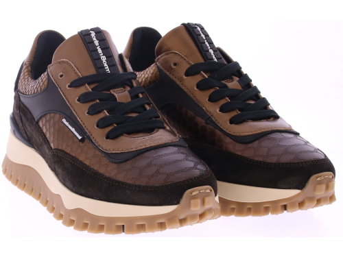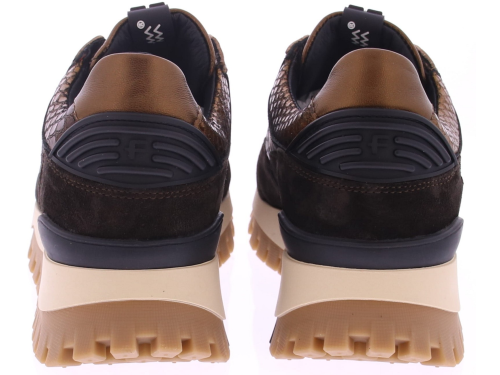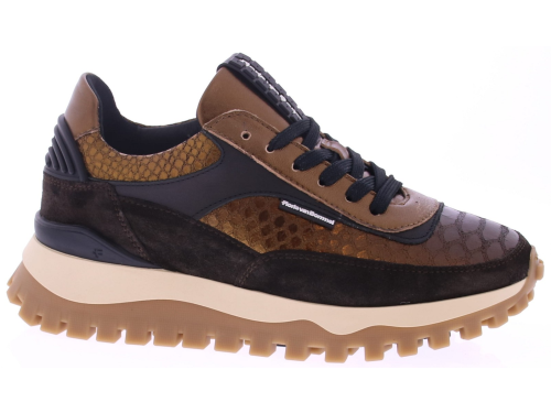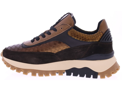 Brons met zwarte sneaker voor dames van Floris van Bommel model Grommi 01.17 brons. Het glanzende metallic leer met slangenprint effect geeft de schoen een glamoureuze uitstraling, terwijl de robuuste blokjes zool zorgt voor een moderne look. Het voetbed van de sneaker is uitneembaar, waardoor je de mogelijkheid hebt om je eigen inlegzolen te gebruiken. De combinatie van materialen, stijlvolle details en het bekende vakmanschap van Floris van Bommel maakt deze sneaker een absolute must-have voor elke modebewuste vrouw. Ideaal om te dragen onder een jeans, jurk of rok.