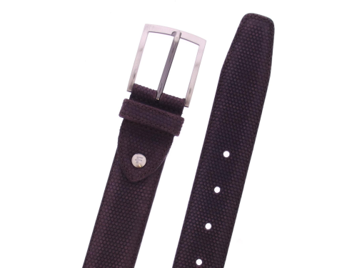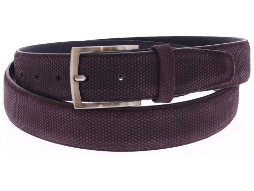 Heren riem van Floris van Bommel in bordeaux geprint suède met leren voering. De riem is in te korten aan de gespkant. De lengte is 115cm.