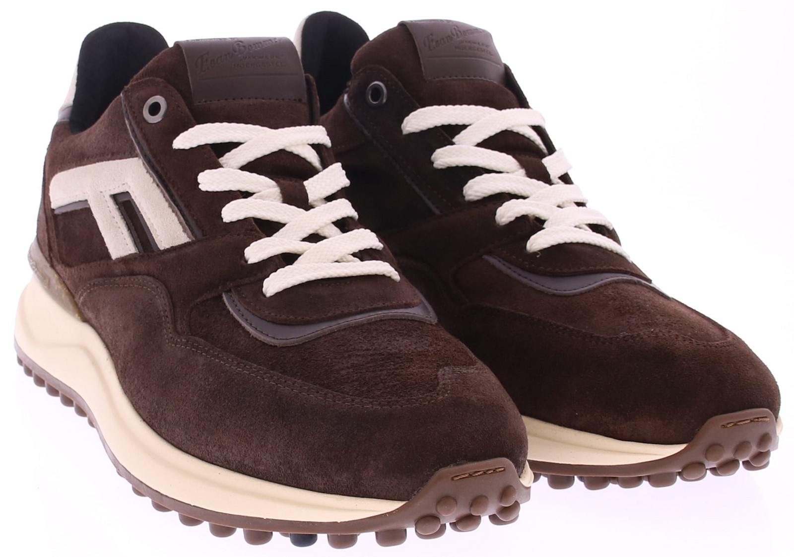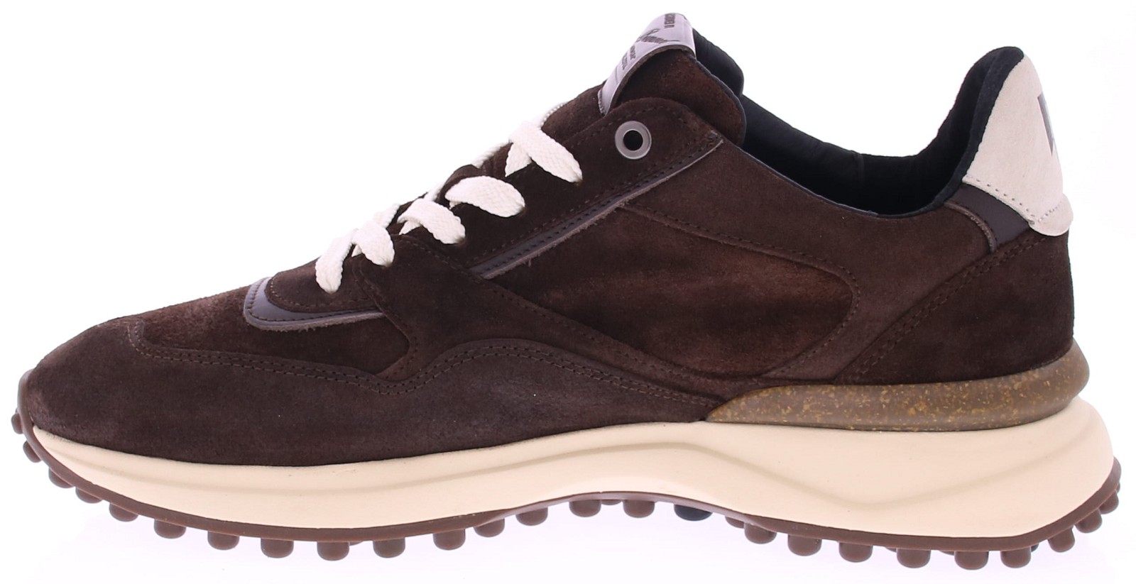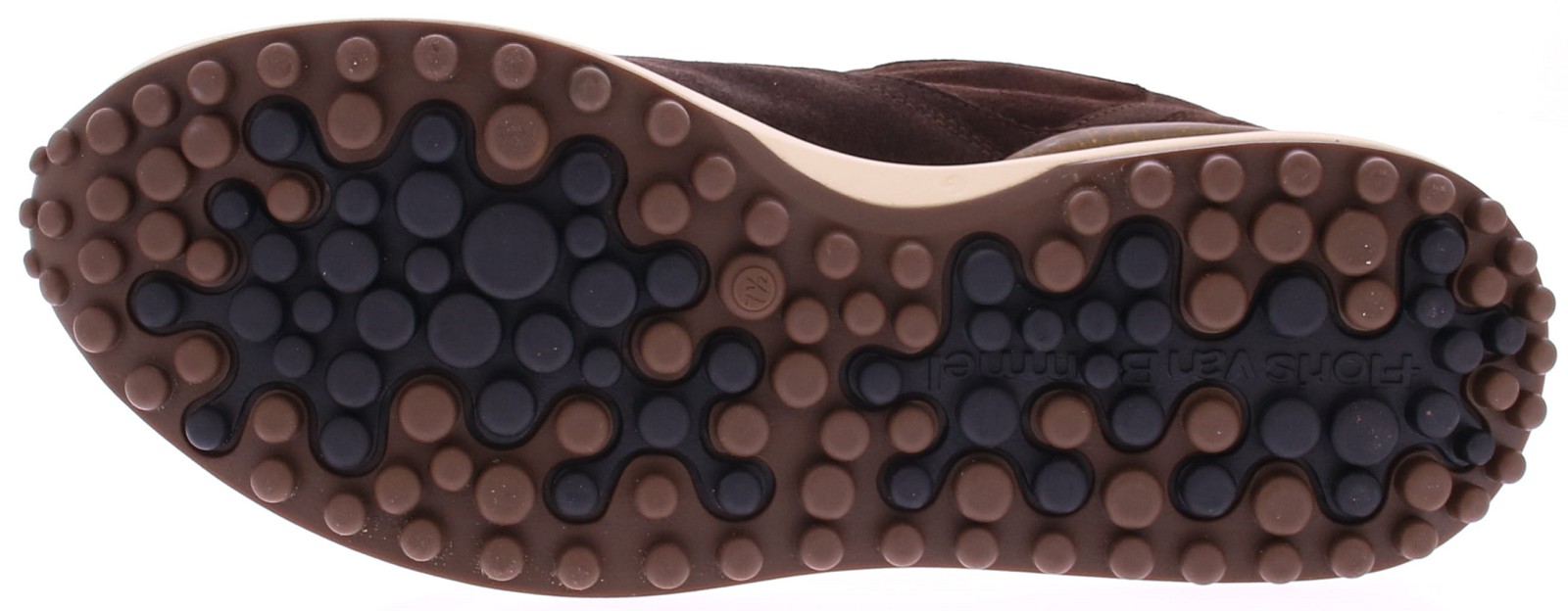 Donkerbruin suède heren sneaker van Floris van Bommel. De Noppi 29.44 is een donkerbruine suède herensneaker die comfort en kwaliteit perfect combineert. De buitenkant is vervaardigd van suède en de binnenkant is volledig gevoerd met soepel leer en voorzien van een uitneembaar voetbed, wat zorgt voor optimaal draagcomfort. De opvallende off-white noppenzool geeft de sneaker een sportieve look. Deze zool is gemaakt van lichtgewicht EVA-materiaal, waardoor de schoen comfortabel en flexibel aanvoelt. Het loopvlak is uitgevoerd in slijtvast TPU, wat zorgt voor extra grip en duurzaamheid. Aan de achterkant bevindt zich een stevige stabilizer met het kenmerkende Floris van Bommel-logo als subtiel detail.