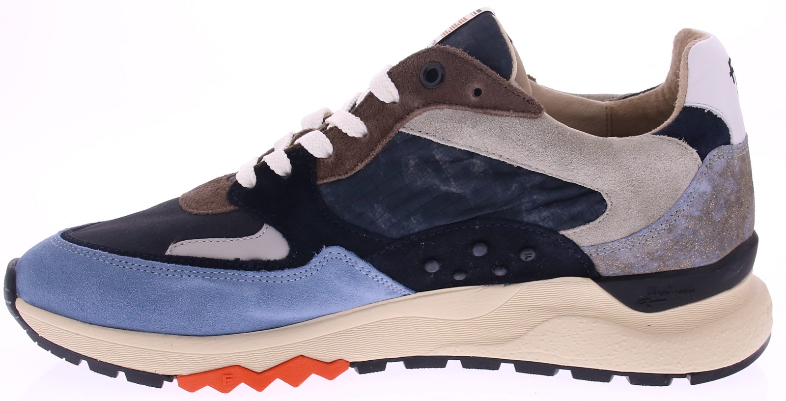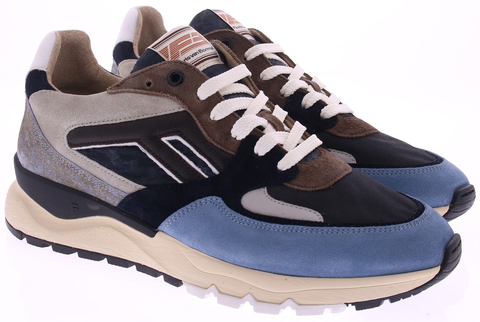 Multikleurige heren sneaker van Floris van Bommel. De Treener 01.26 is uitgevoerd in een rijke mix van lichtblauw leer. De binnenkant van de sneaker is afgewerkt met een lederen voering. Het uiterst comfortabele voetbed, dat ook met leer bekleed is, is uitneembaar en kan eventueel worden vervangen door een eigen voetbed of steunzool. Deze sneaker is gemaakt op een sportieve leest in een G1/2-wijdte, wat betekent dat ook een wat bredere voet er prima in past.