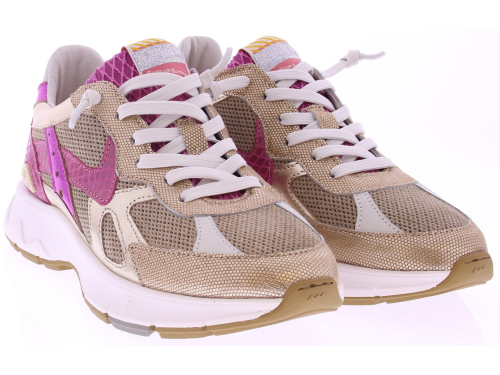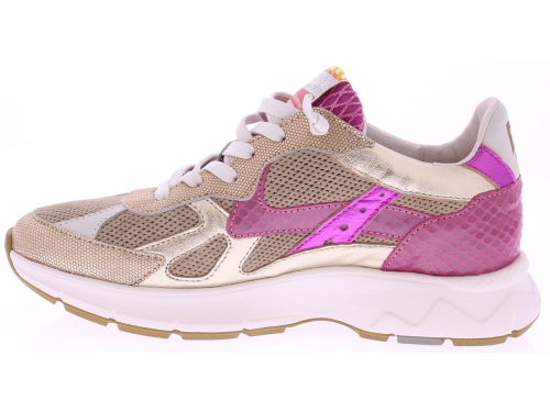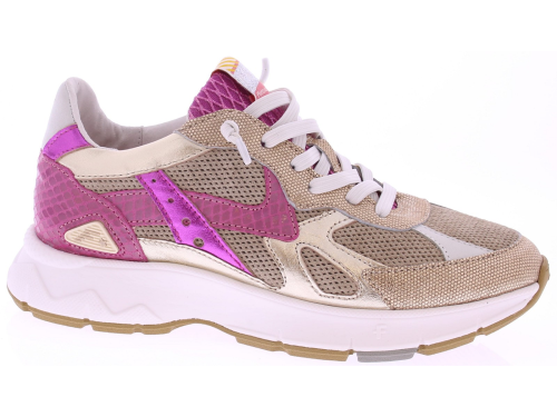 Beige met brons leren/suede dames sneakers van Floris van Bommel, model Daysi 05.03. Deze moderne sneaker is opgebouwd uit hoogwaardige materialen zoals soepel leer, suède en ademend mesh met fuchsia en roze accenten. De zool met sportieve belijning biedt uitstekende demping. Het uitneembare voetbed kan eenvoudig worden vervangen door uw eigen persoonlijke inlegzool. Perfect te combineren meteen casual look. Ontdek ook de andere dames sneakers van Floris van Bommel bij Klijsen.
