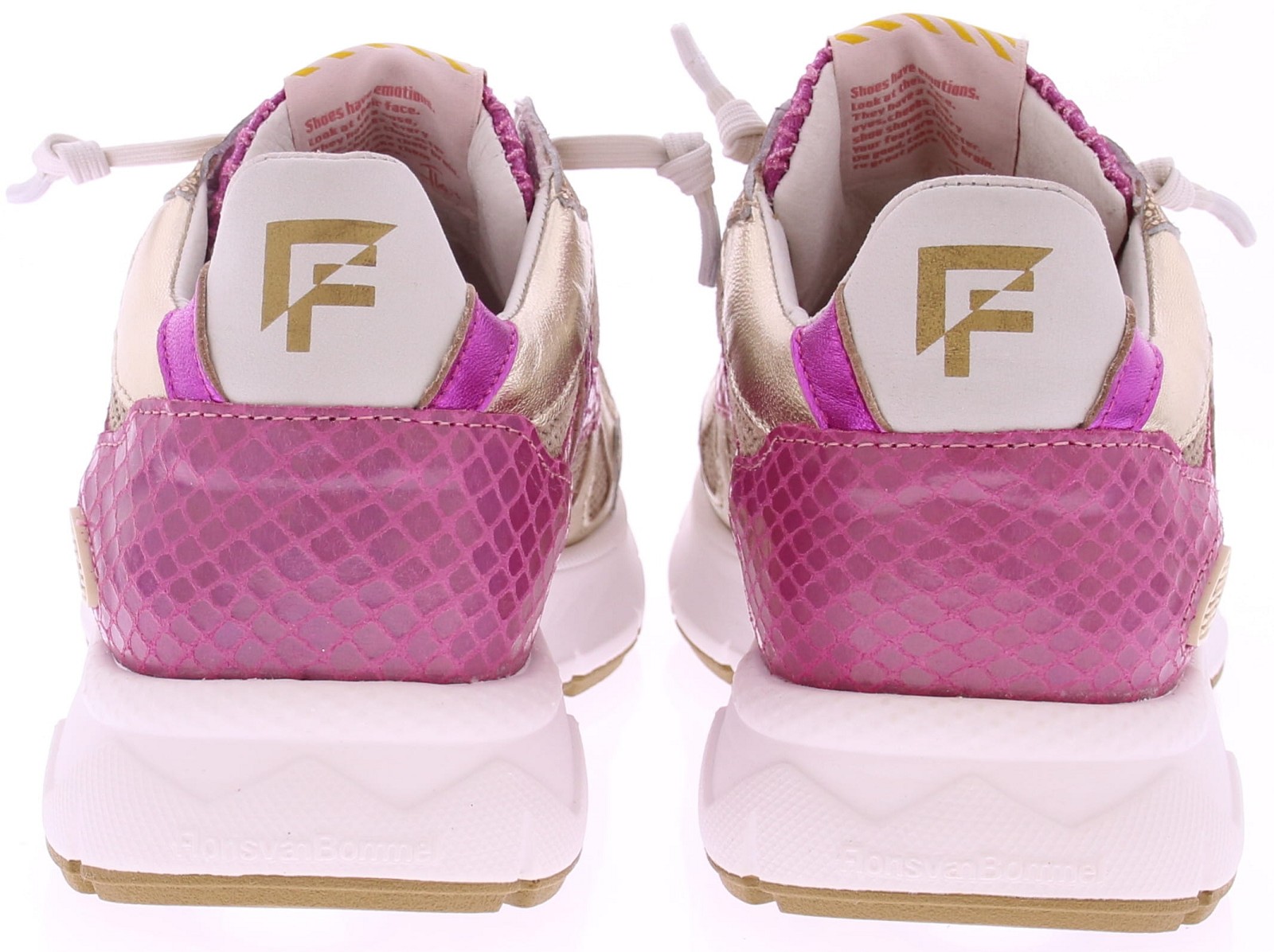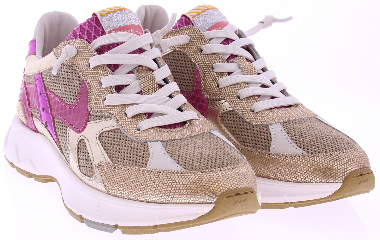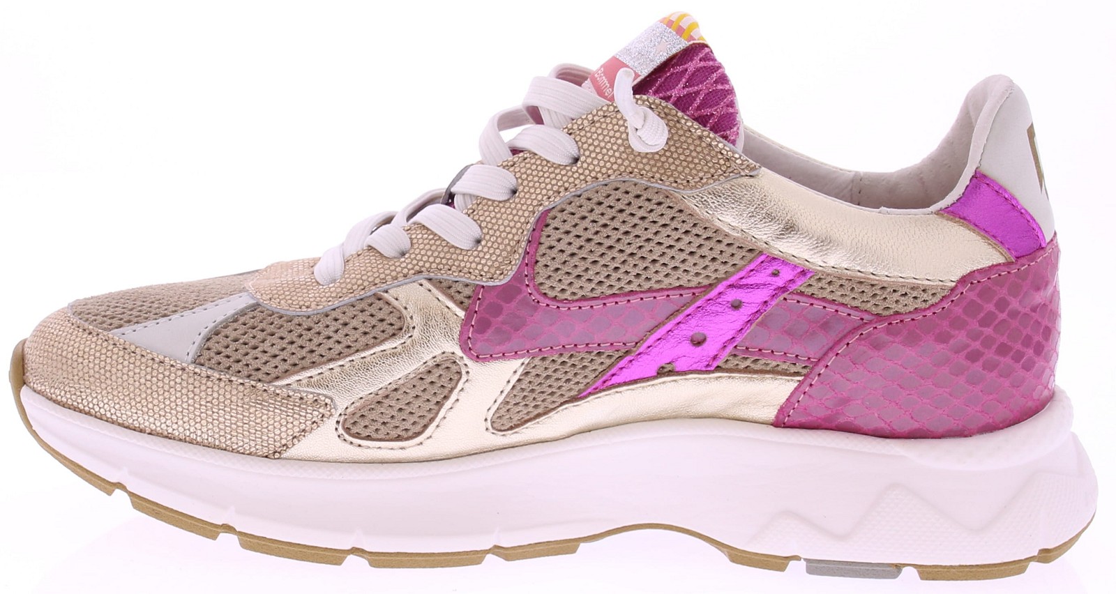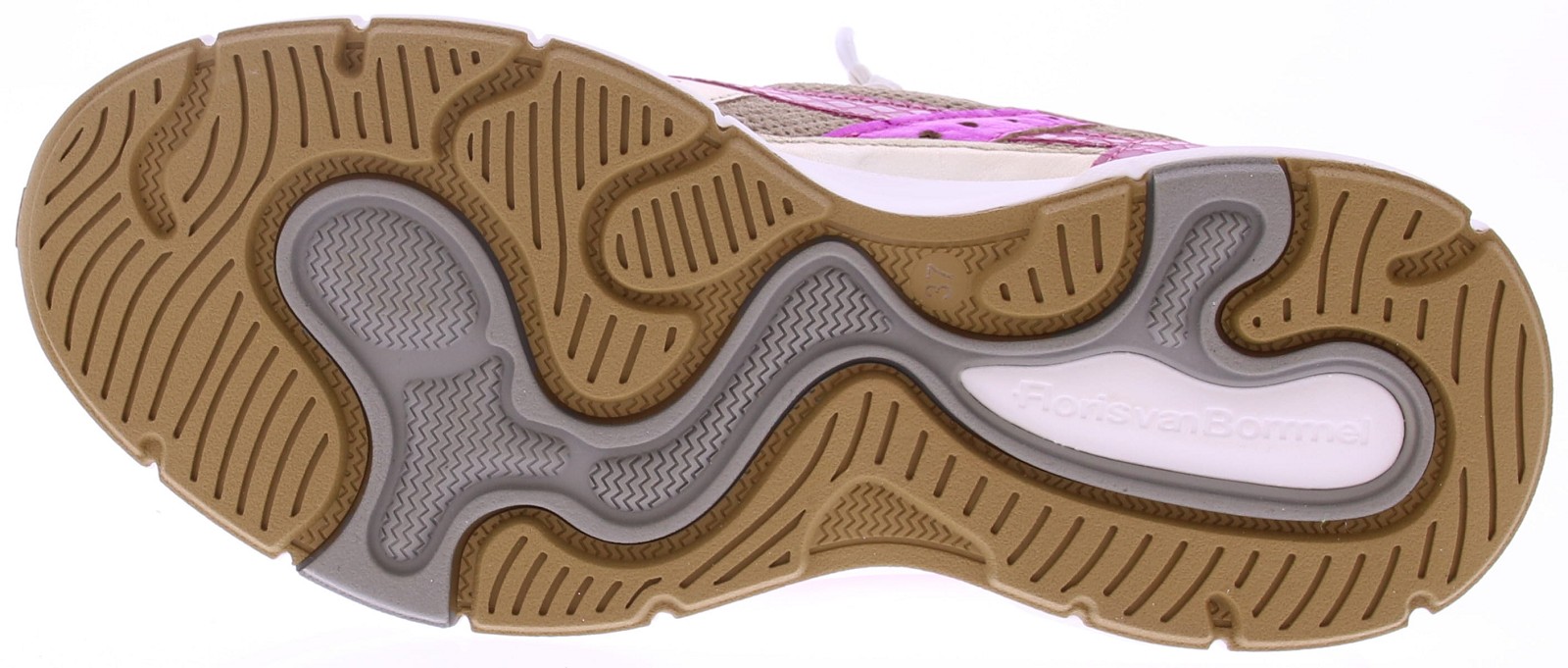 Beige met brons leren/suede dames sneakers van Floris van Bommel, model Daysi 05.03. Deze moderne sneaker is opgebouwd uit hoogwaardige materialen zoals soepel leer, suède en ademend mesh met fuchsia en roze accenten. De zool met sportieve belijning biedt uitstekende demping. Het uitneembare voetbed kan eenvoudig worden vervangen door uw eigen persoonlijke inlegzool. Perfect te combineren meteen casual look. Ontdek ook de andere dames sneakers van Floris van Bommel bij Klijsen.