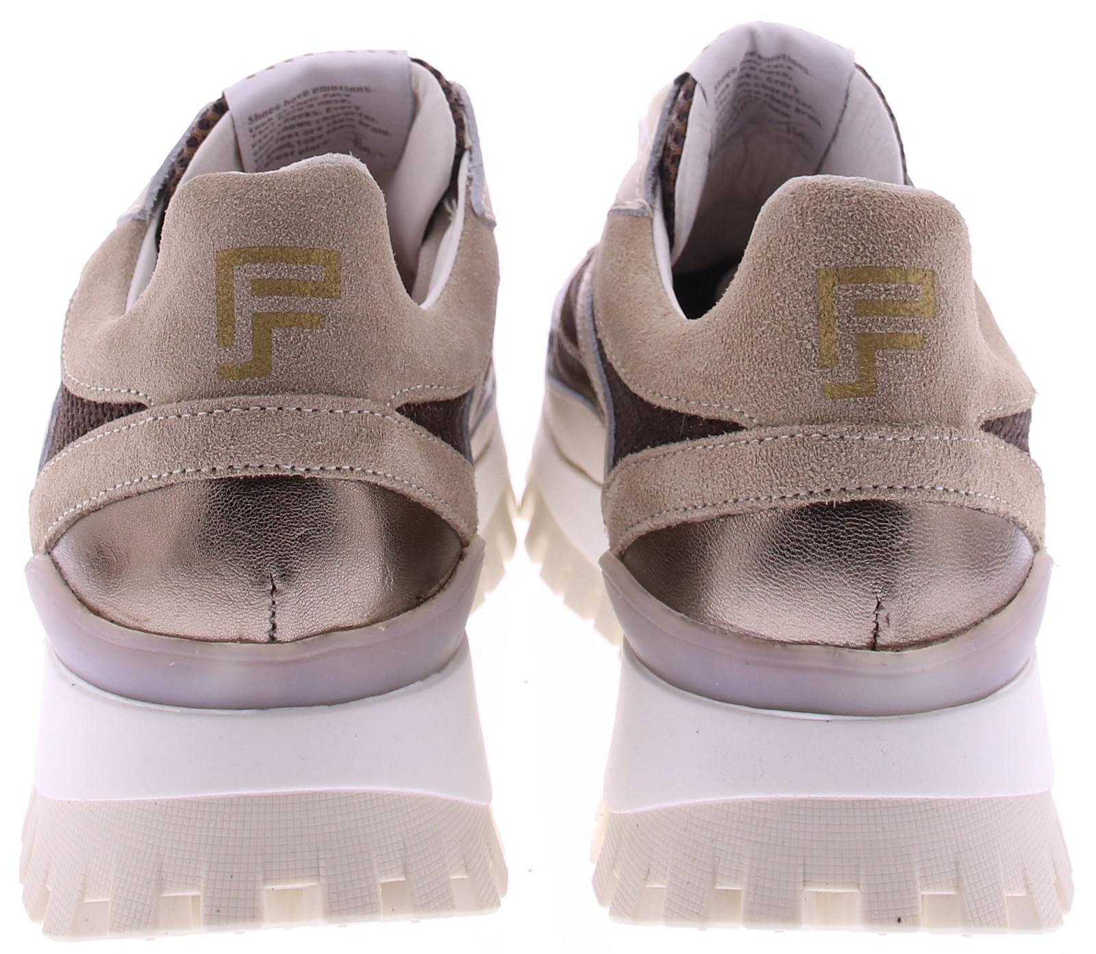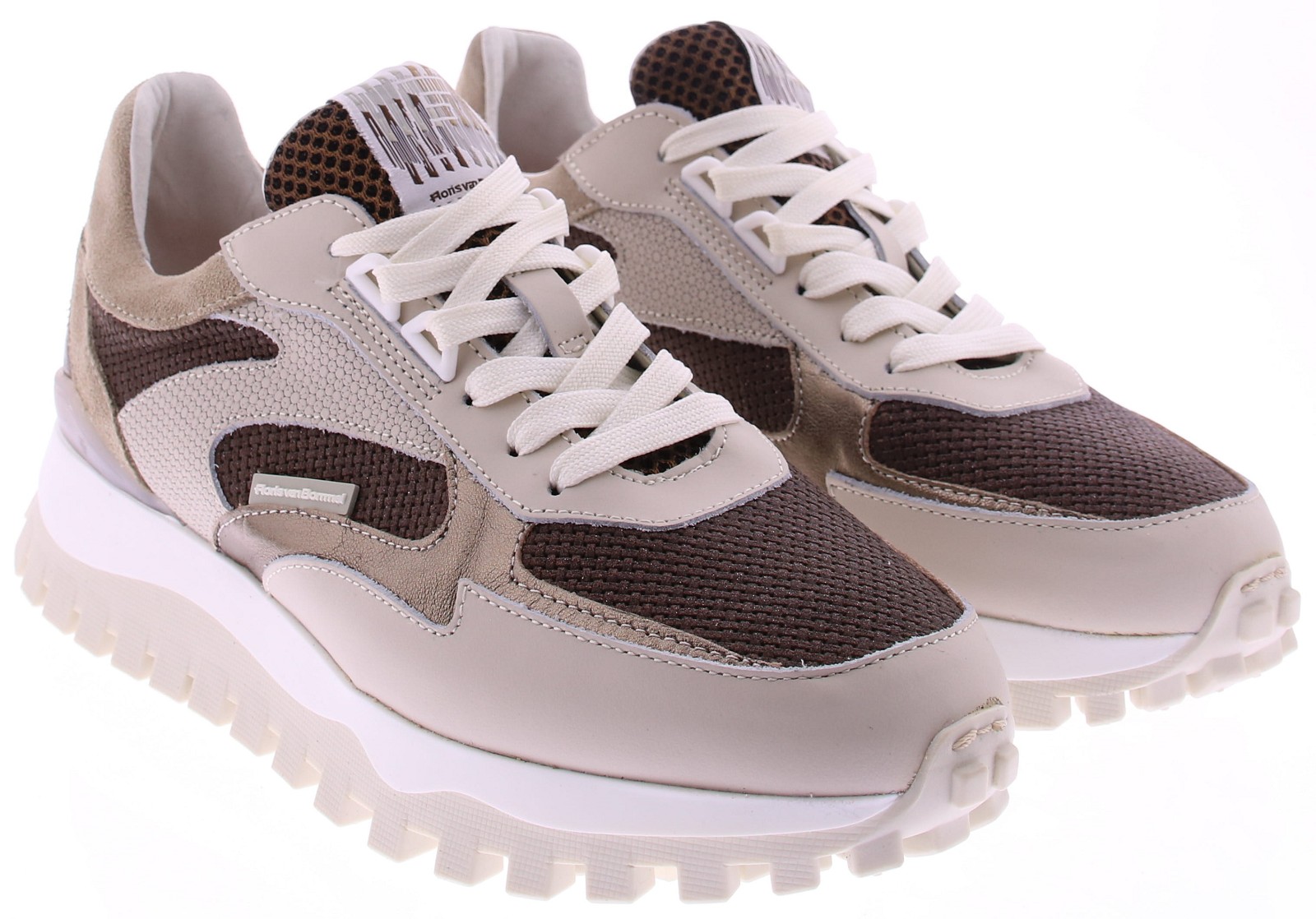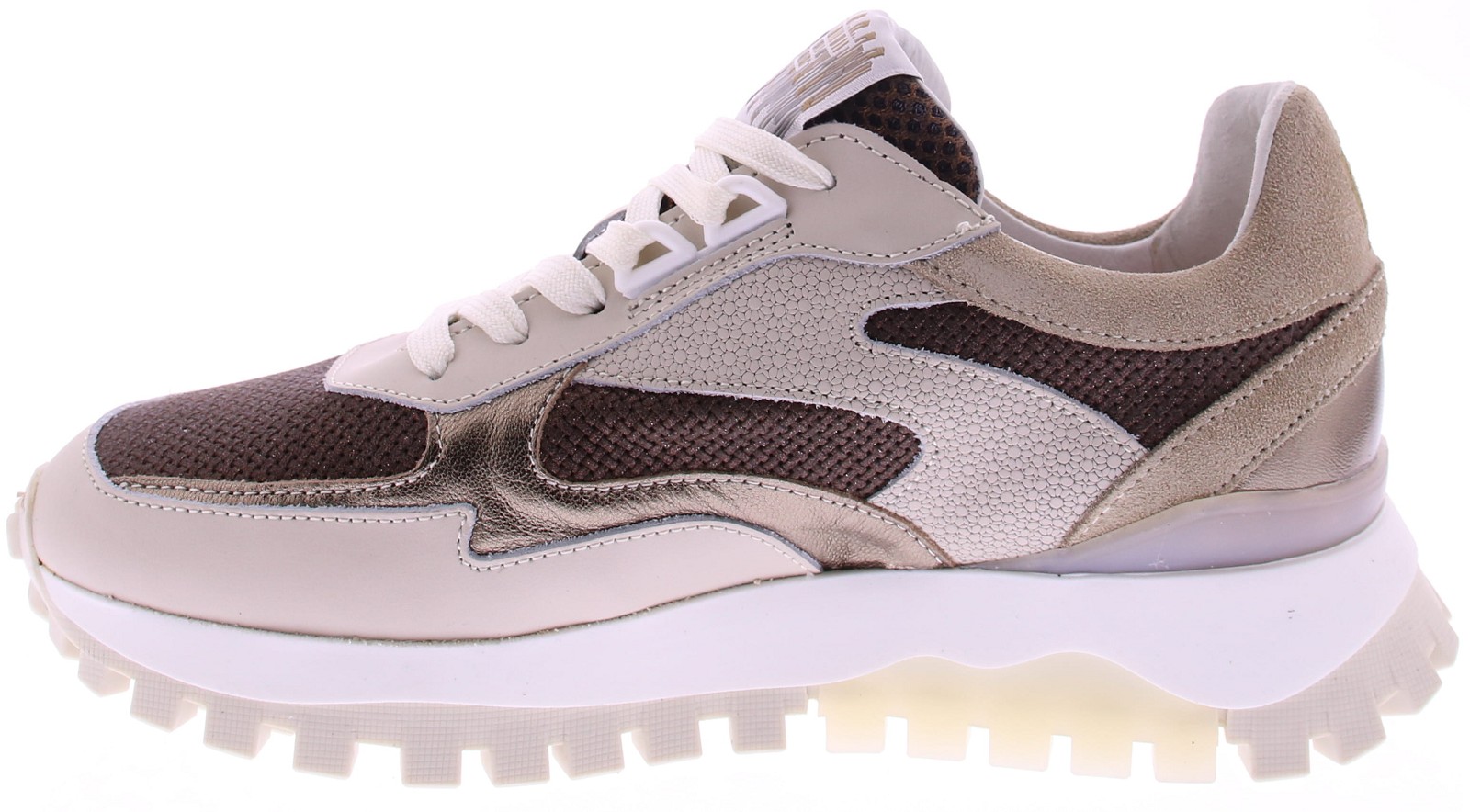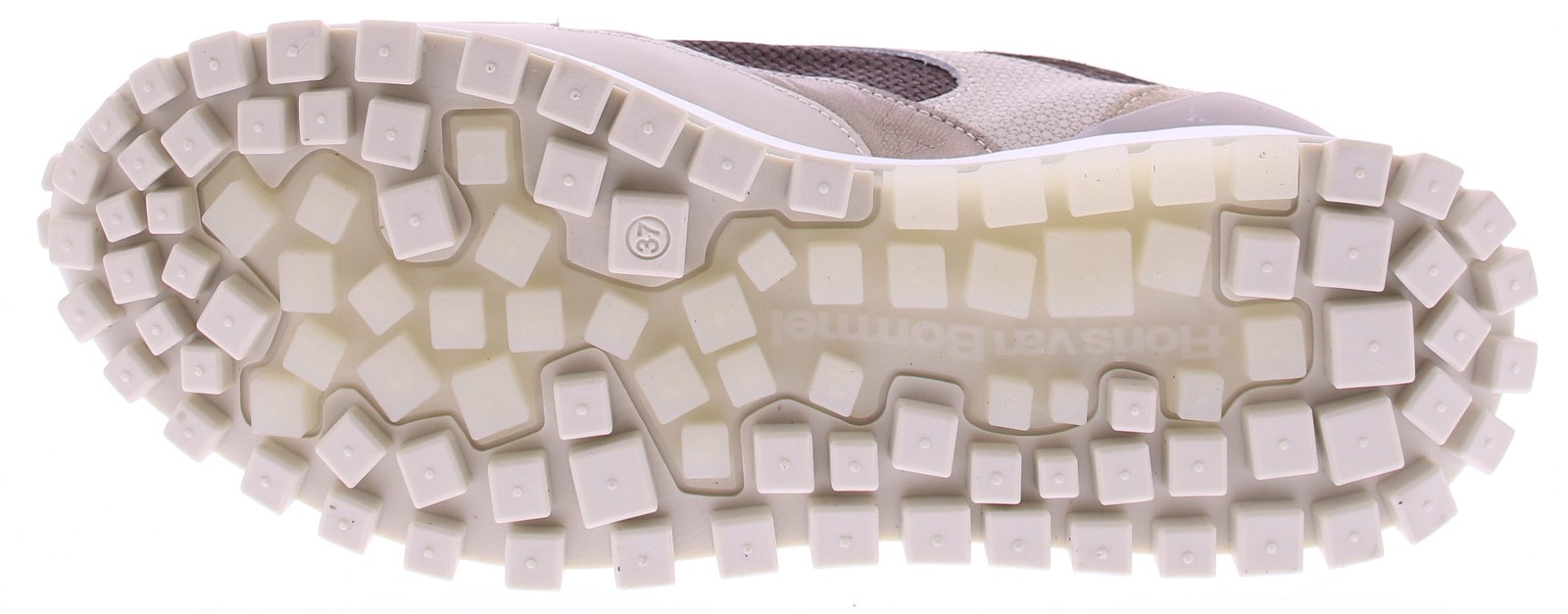 Beige/bruine dames sneakers van Floris van Bommel, model Grommi 03.06. Een combi van leer, metallic accenten, suède en leer met print geeft deze sneaker een moderne, gelaagde uitstraling. De stevige profielzool zorgt voor uitstekende grip en een licht verend loopcomfort. Het uitneembare voetbed kan eenvoudig worden vervangen door uw eigen persoonlijke inlegzool. Een stijlvolle keuze voor wie houdt van comfort met een modieuze twist. Ontdek ook de andere dames sneakers van Floris van Bommel bij Klijsen.