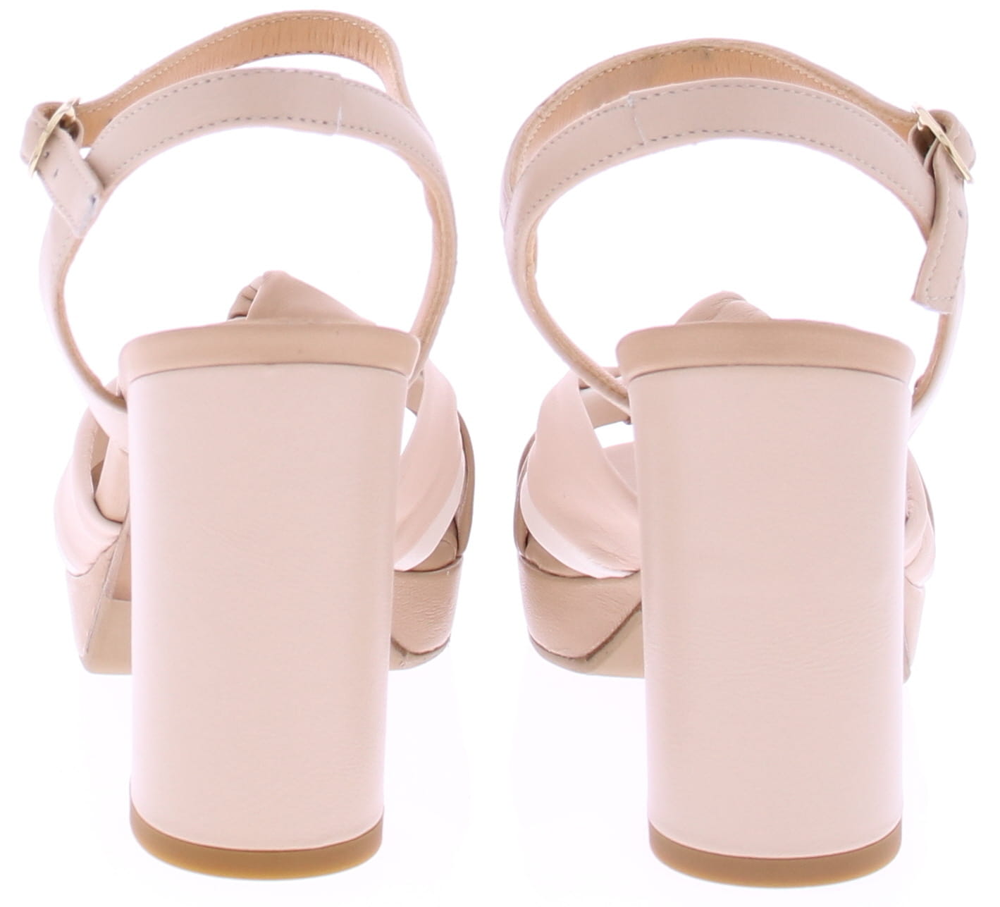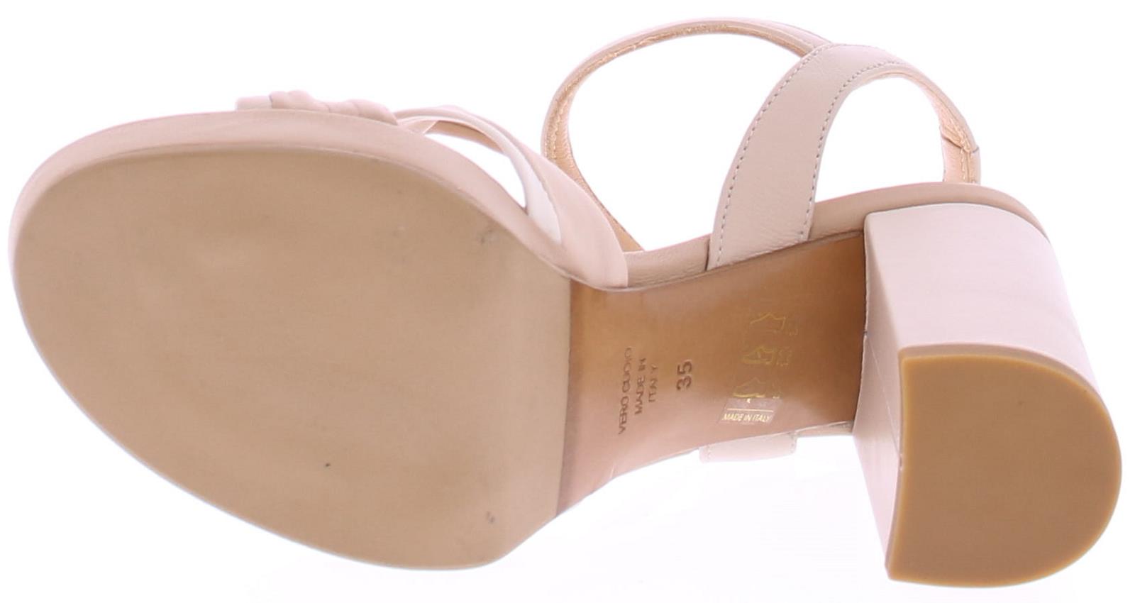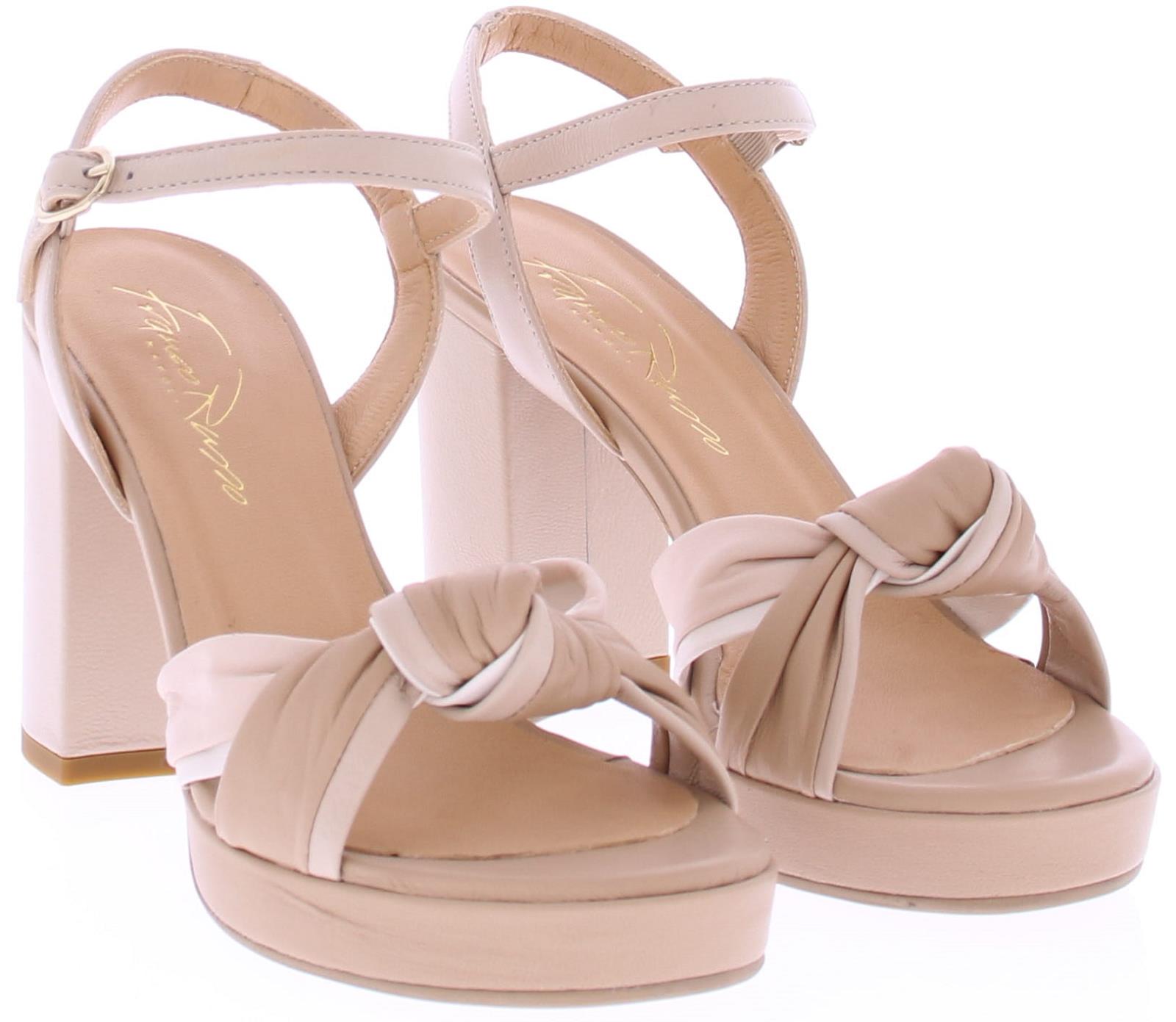 Beige leren dames sandaal van Franco Russo. Deze sandaal heeft leuke geknoopte bandjes over de voorvoet en om de hiel een bandje met een verstelbare gesp. De plateau zool heeft een hoogte van 2 cm en de hak 8 cm.