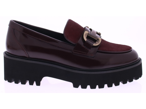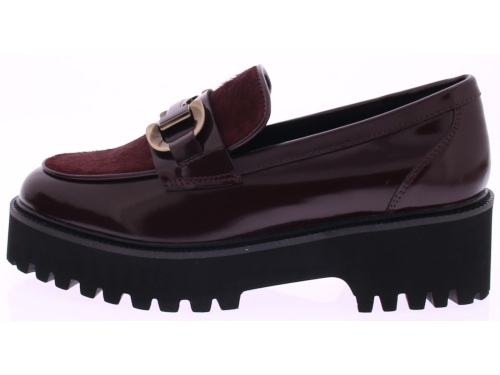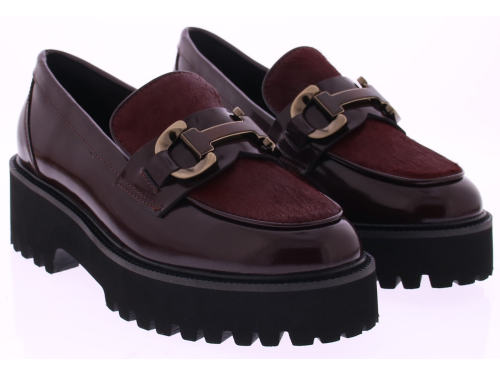Bordeaux dames instapper met bit van Gioia. Op een sportievere rubberen profielzool. Deze loafers zijn gemaakt van poets leer met op het bovenblad pony Het bordeaux met matgouden bit is uitgevoerd in metaal. De voering is van leer en de hakhoogte is 2 cm.