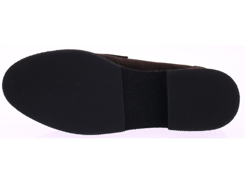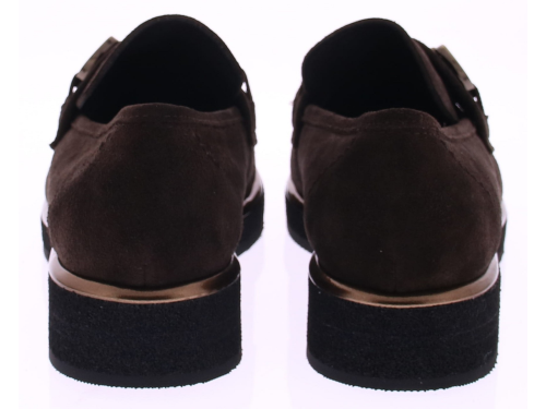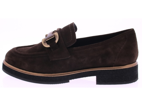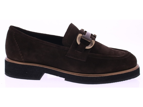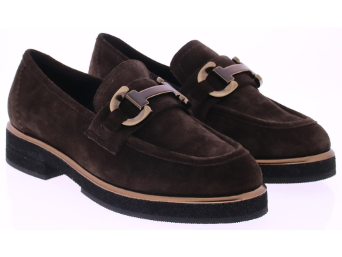 Donkerbruin suede dames instapper met bit van Gioia. Op een sportieve zool. Langs de zoolrand loopt een metallickleurige lijn voor een sprekend effect. Het bruin met matgouden bit is uitgevoerd in metaal. De voering is van leer en de hakhoogte is 2 cm.