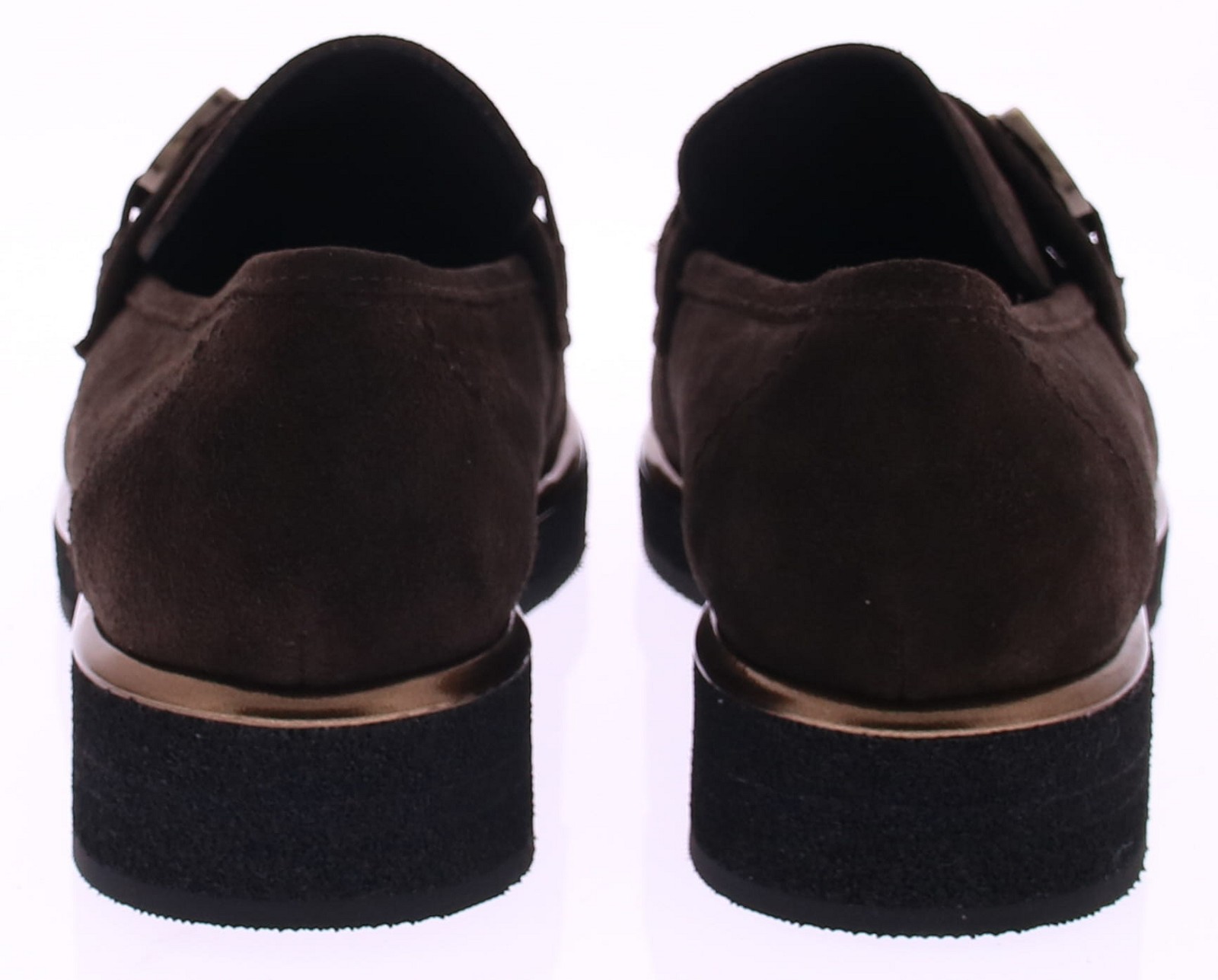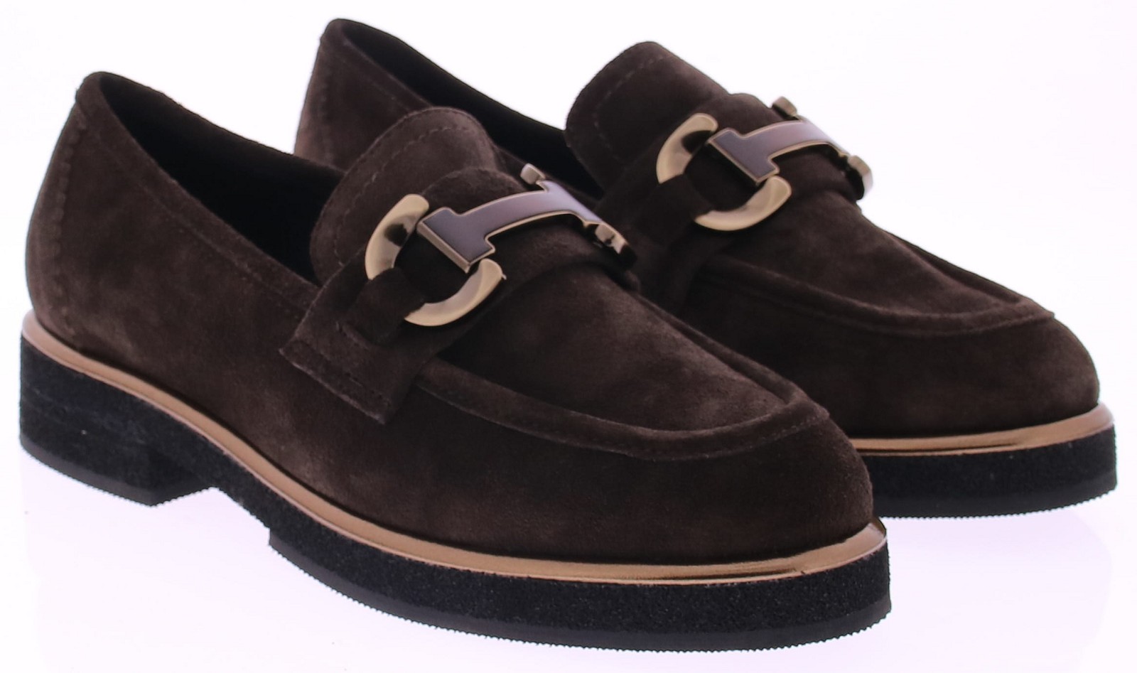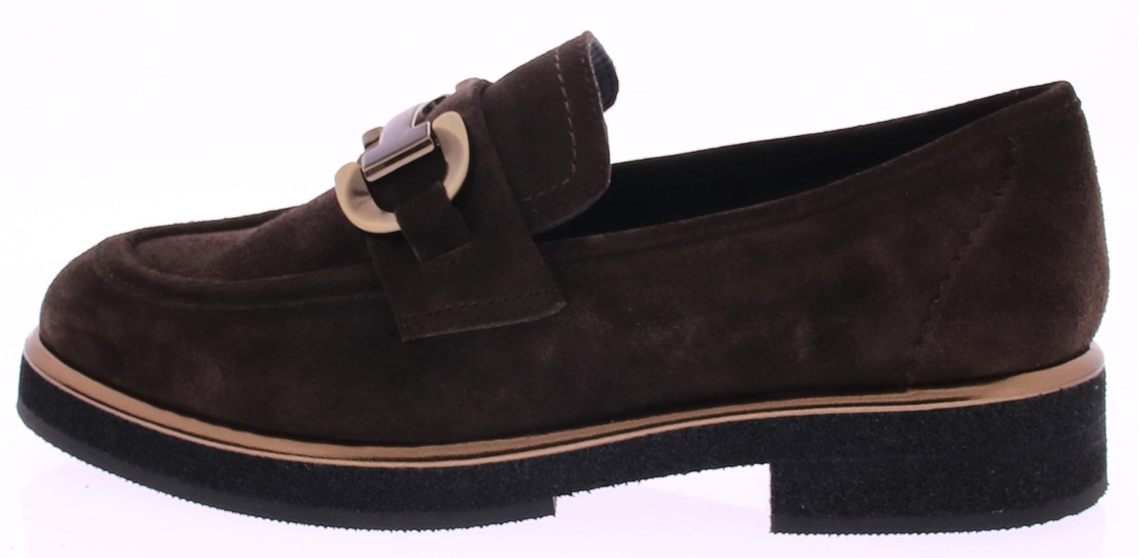 Donkerbruin suede dames instapper met bit van Gioia. Op een sportieve zool. Langs de zoolrand loopt een metallickleurige lijn voor een sprekend effect. Het bruin met matgouden bit is uitgevoerd in metaal. De voering is van leer en de hakhoogte is 2 cm.