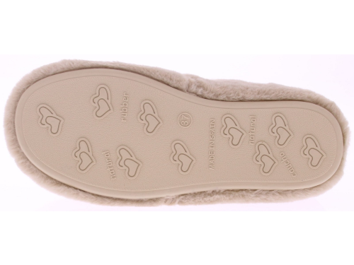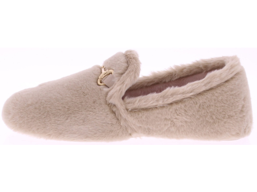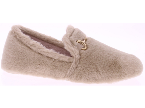Beige super zachte pantoffel van imitatiebont met goudkleurig bitje op de wreef van Gioia. Het uitneembare voetbed en de voering zijn van imitatievacht. De pantoffel heeft flexibele rubberen zool.