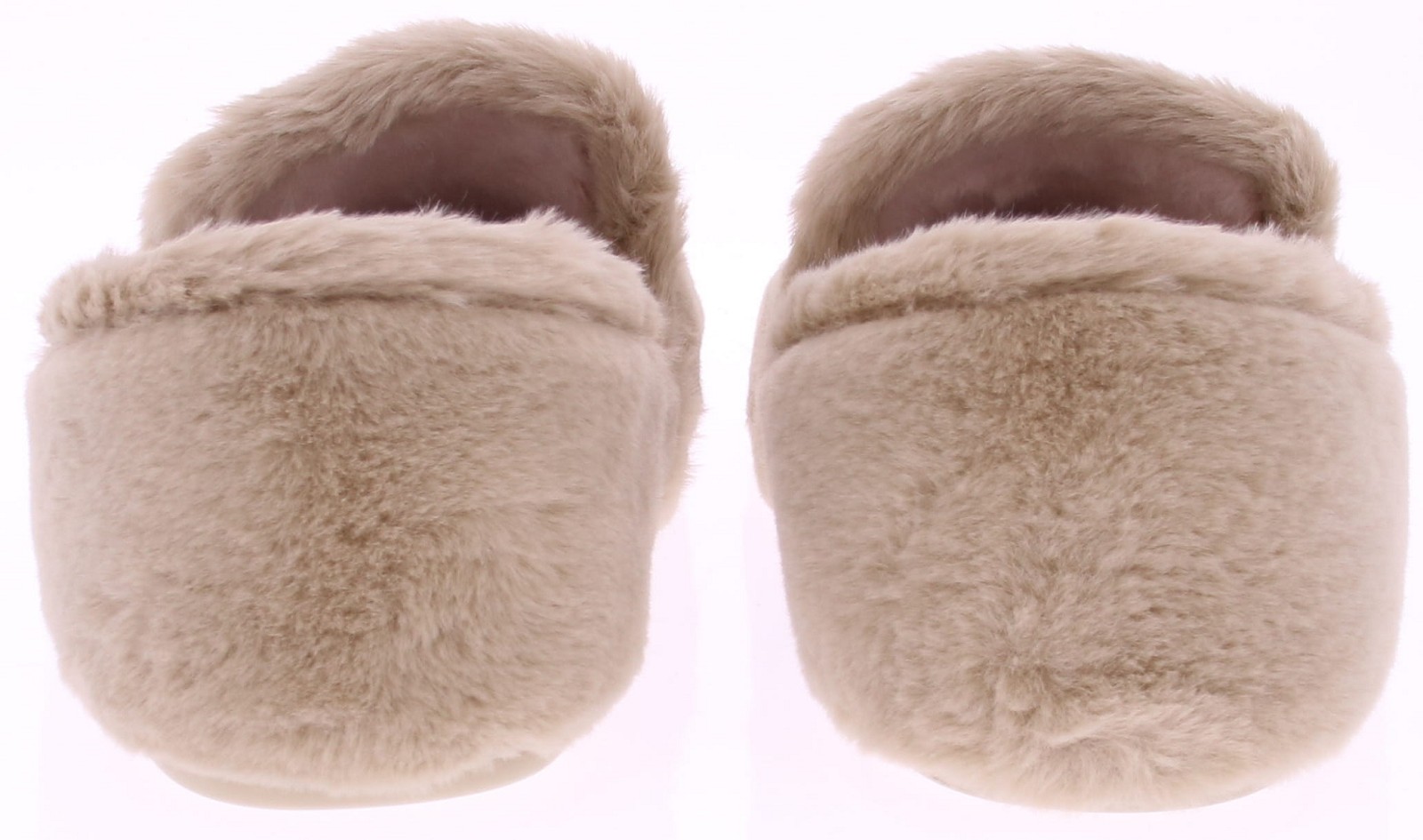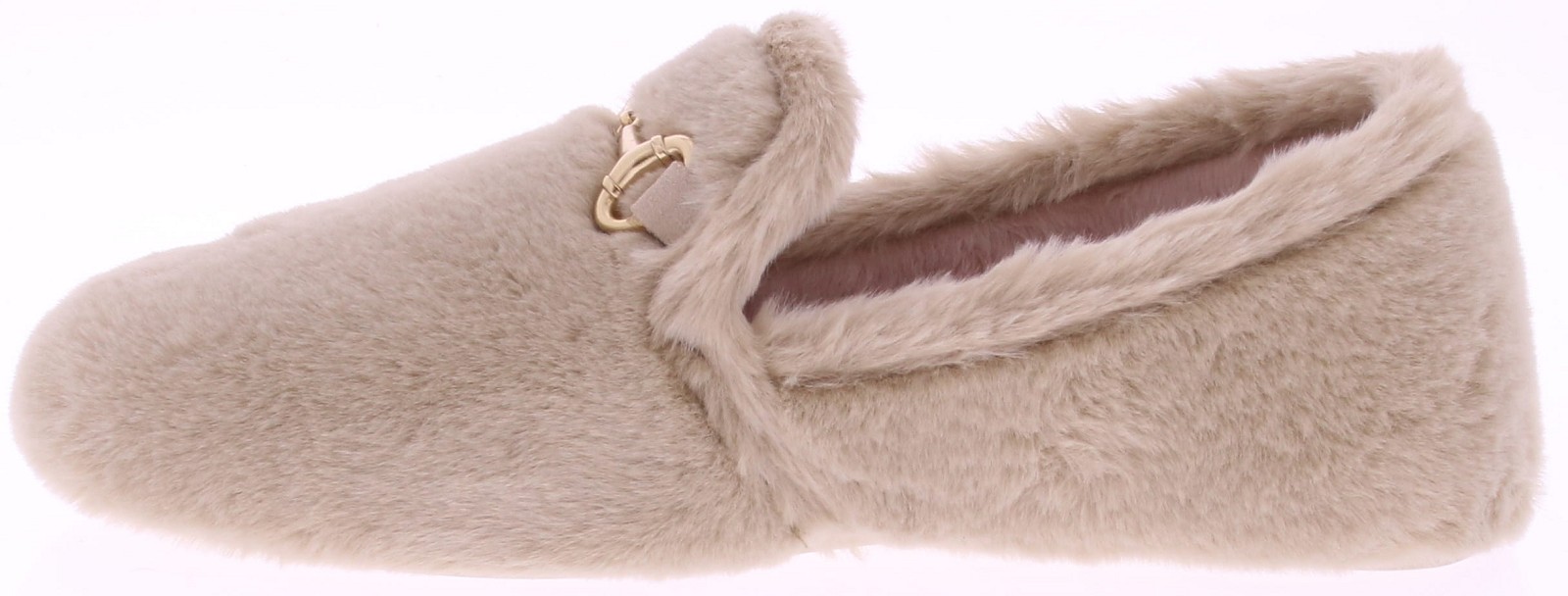 Beige super zachte pantoffel van imitatiebont met goudkleurig bitje op de wreef van Gioia. Het uitneembare voetbed en de voering zijn van imitatievacht. De pantoffel heeft flexibele rubberen zool.