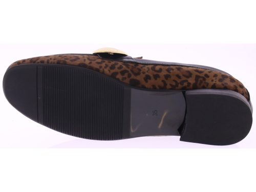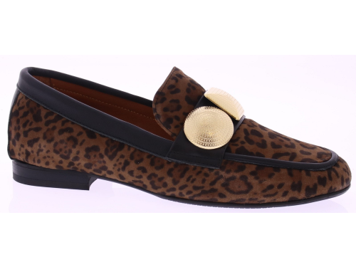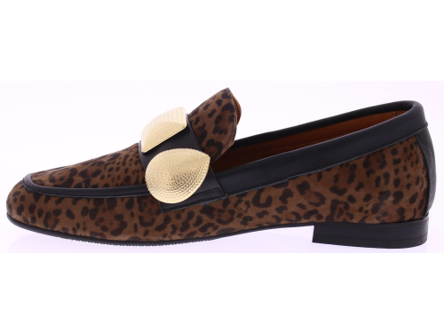 Bruin suede panterprint dames instapper van Gioia. Deze opvallende instapper van Gioia is een echte eyecatcher. Uitgevoerd in een donkere panterprint, afgewerkt met grote goudkleurige garneringen en zwarte leren biezen rondom de schoen. Draag ‘m casual onder een jeans of chic onder een zwarte pantalon – deze instapper trekt altijd de aandacht.