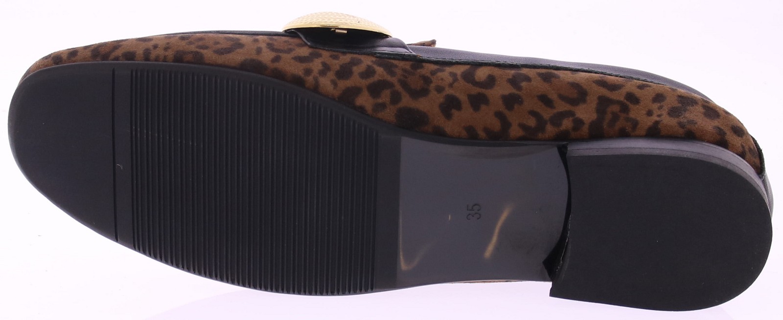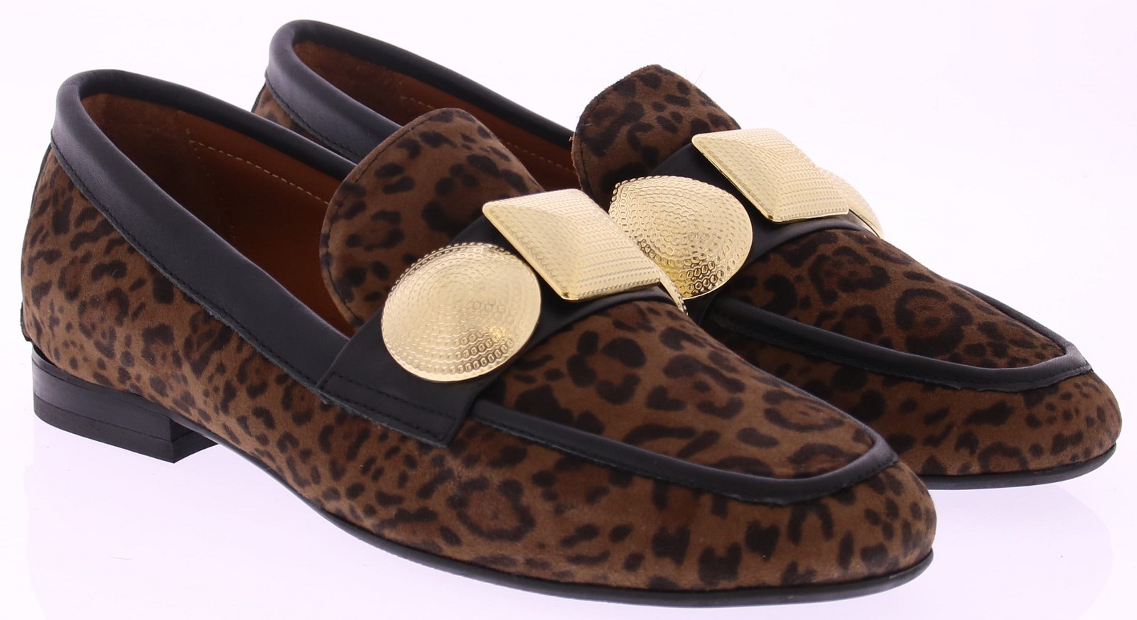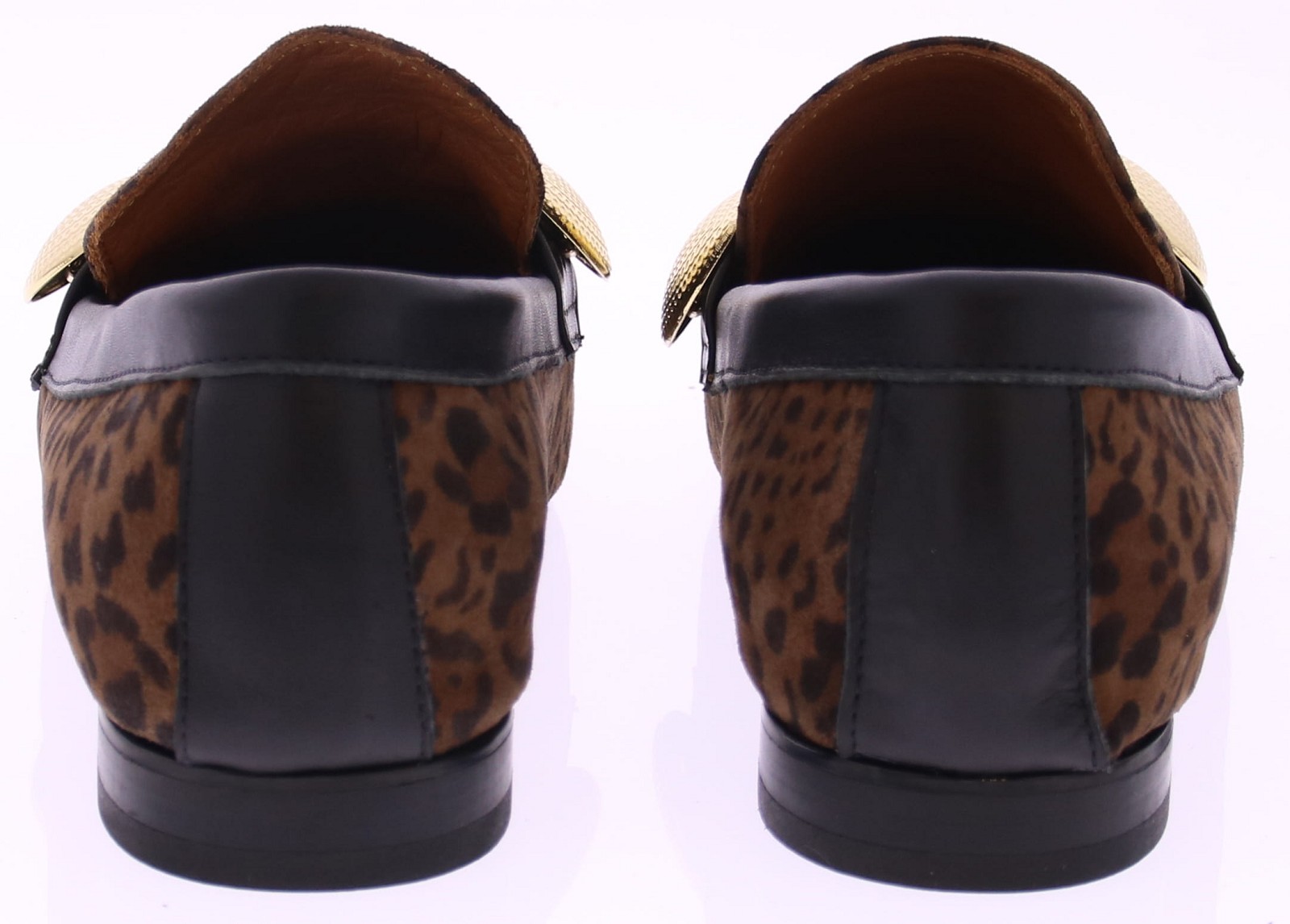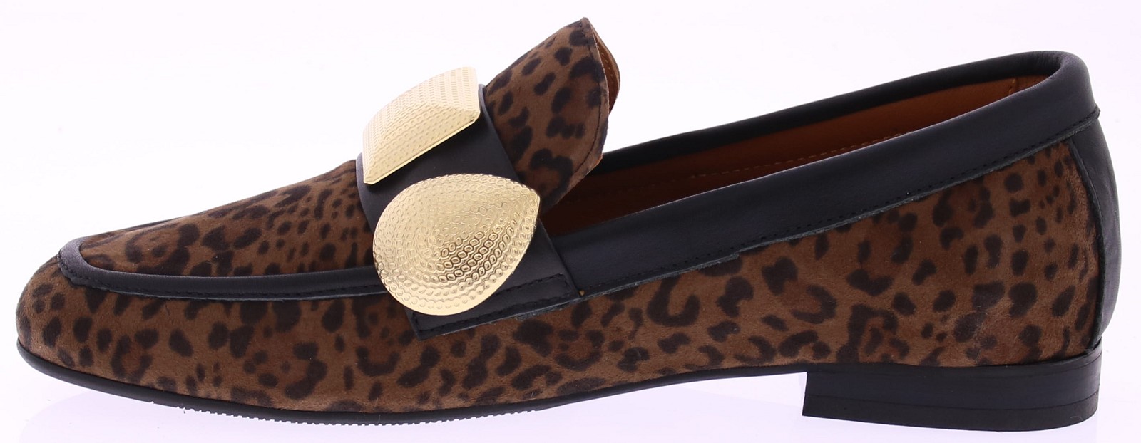 Bruin suede panterprint dames instapper van Gioia. Deze opvallende instapper van Gioia is een echte eyecatcher. Uitgevoerd in een donkere panterprint, afgewerkt met grote goudkleurige garneringen en zwarte leren biezen rondom de schoen. Draag ‘m casual onder een jeans of chic onder een zwarte pantalon – deze instapper trekt altijd de aandacht.
