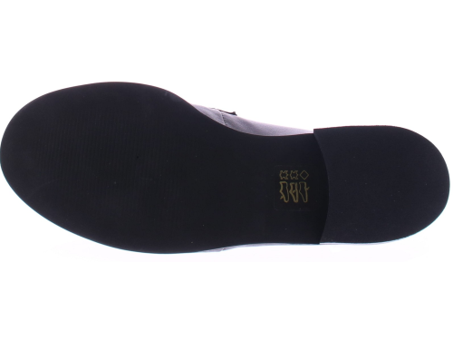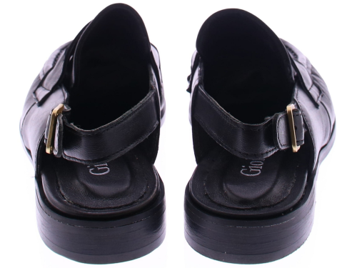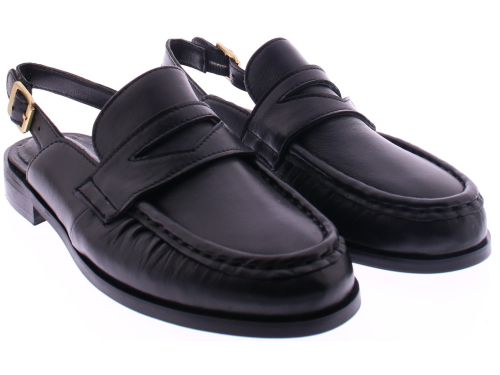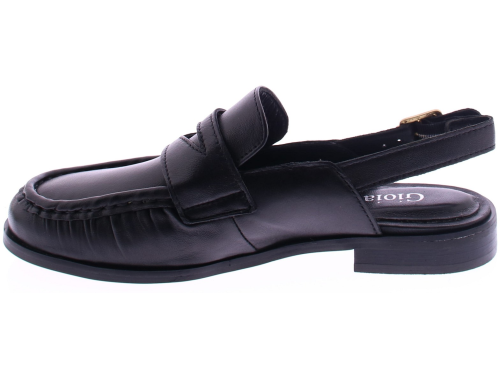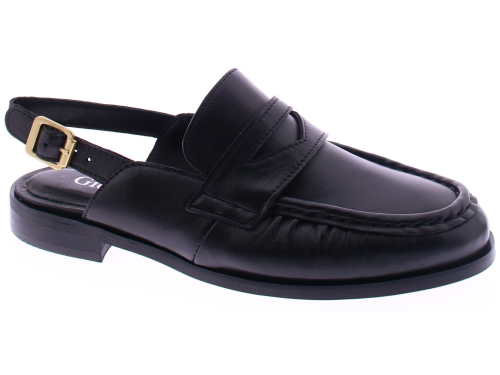 Zwarte leren dames slingback loafers van Gioia, model Zuleya. Deze loafers hebben een klassieke pennyloafer-vorm met een handgestikte mocassinrand en een open hiel voor een luchtige, moderne uitstraling. De verstelbare hielband met goudkleurig gespje zorgt voor een prettige pasvorm. Het soepele leer vormt comfortabel om de voet, terwijl de platte zool zorgt voor licht loopcomfort. Een stijlvol en veelzijdig model dat moeiteloos combineert met zowel een elegante broek als een zomerse jurk. Ontdek ook de andere dames slingback loafers van Gioia bij Klijsen.
