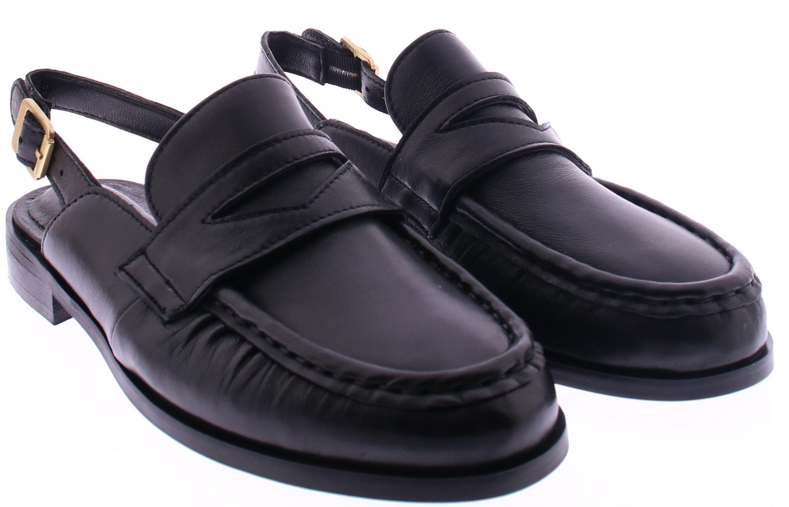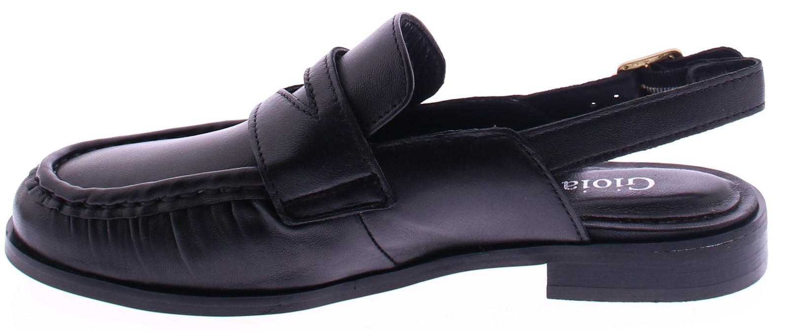 Zwarte leren dames slingback loafers van Gioia, model Zuleya. Deze loafers hebben een klassieke pennyloafer-vorm met een handgestikte mocassinrand en een open hiel voor een luchtige, moderne uitstraling. De verstelbare hielband met goudkleurig gespje zorgt voor een prettige pasvorm. Het soepele leer vormt comfortabel om de voet, terwijl de platte zool zorgt voor licht loopcomfort. Een stijlvol en veelzijdig model dat moeiteloos combineert met zowel een elegante broek als een zomerse jurk. Ontdek ook de andere dames slingback loafers van Gioia bij Klijsen.