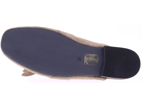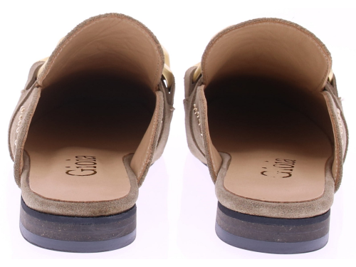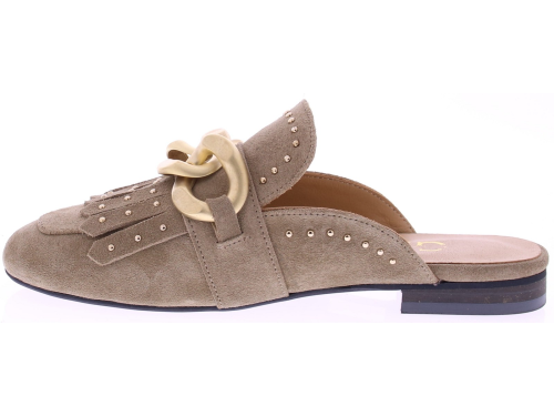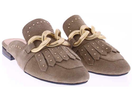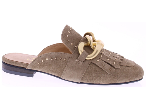 Taupe suède dames muil van Gioia, model Wynne2. Deze elegante muiltjes zijn uitgevoerd in zacht suède en afgewerkt met een goudkleurige chain-garnering en subtiele studs. De ronde neus en het verfijnde jamboree-detail geven het model extra karakter, terwijl het soepele voetbed en de lage hak zorgen voor prettig draagcomfort tijdens warme dagen. Ontdek ook de andere dames slippers van Gioia bij Klijsen.