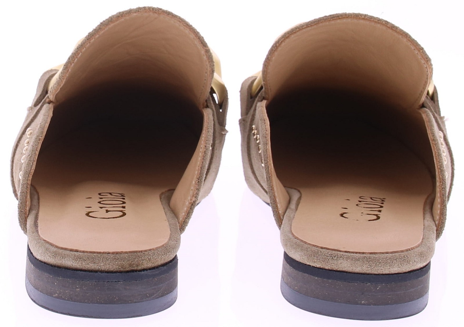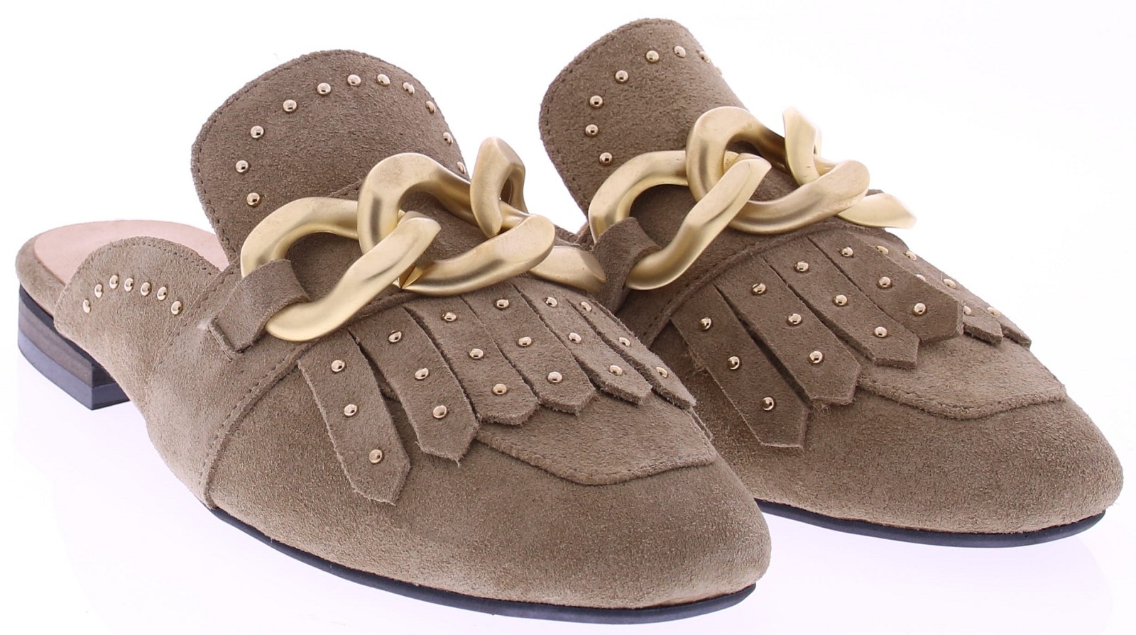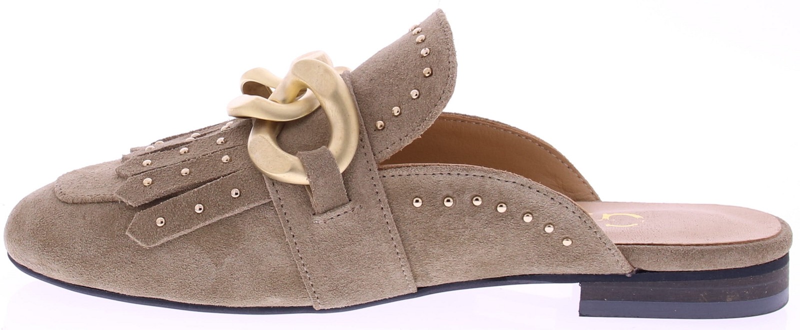 Taupe suède dames muil van Gioia, model Wynne2. Deze elegante muiltjes zijn uitgevoerd in zacht suède en afgewerkt met een goudkleurige chain-garnering en subtiele studs. De ronde neus en het verfijnde jamboree-detail geven het model extra karakter, terwijl het soepele voetbed en de lage hak zorgen voor prettig draagcomfort tijdens warme dagen. Ontdek ook de andere dames slippers van Gioia bij Klijsen.