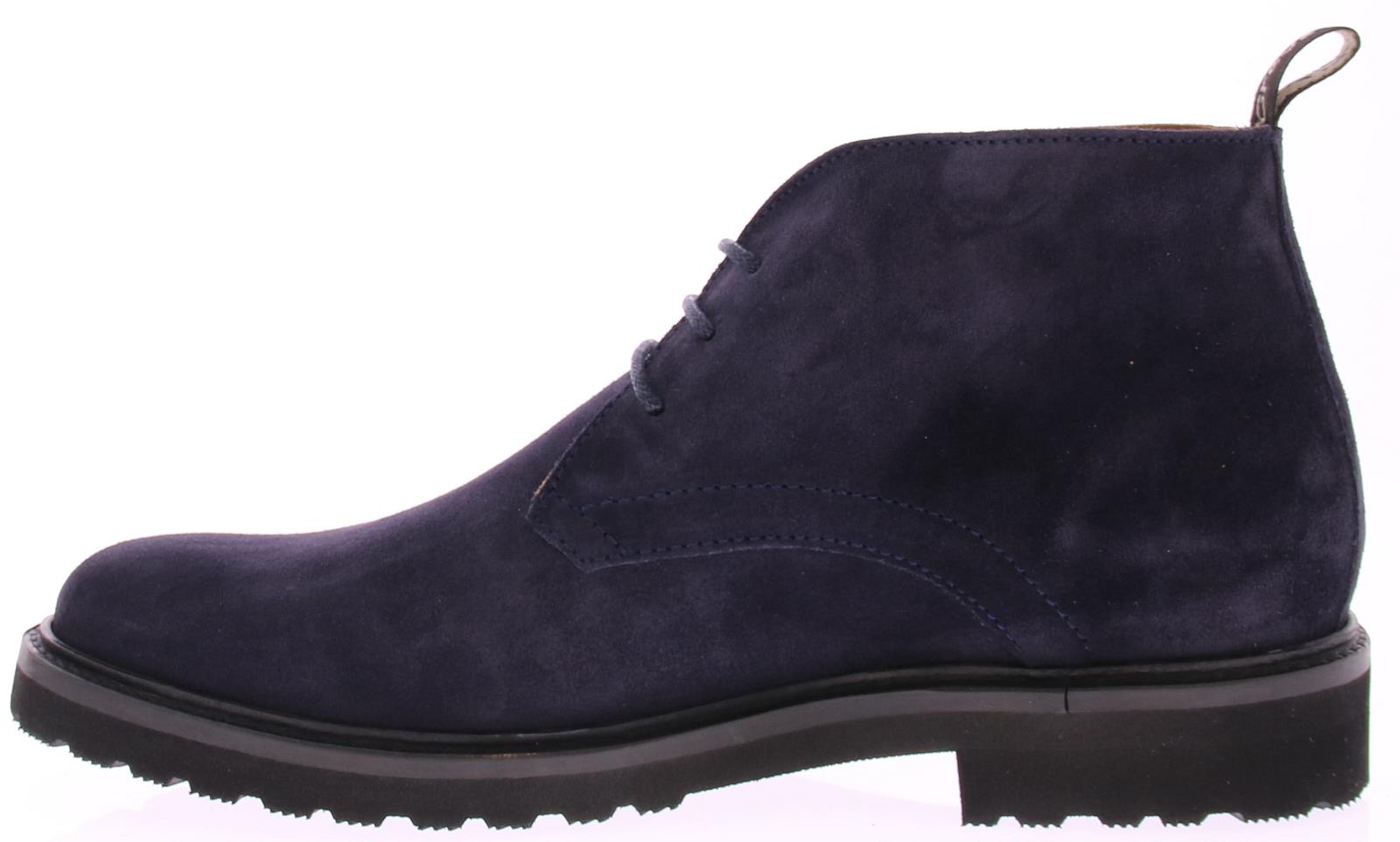 Veterboot in suede op een rubber zool met leren voering uitgevoerd in donker blauw suede. De breedte is H en het voetbed is uitneembaar.