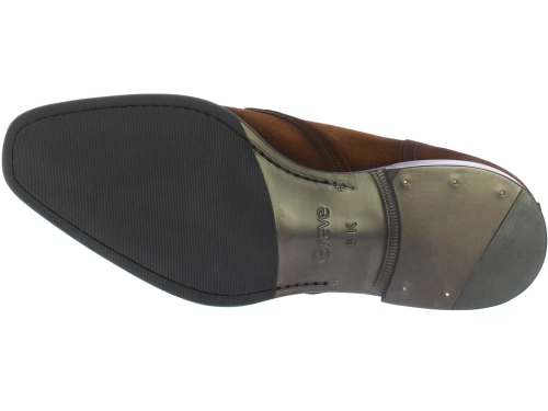 Cognac kleurige suede heren veterschoen van Greve. Deze schoen is uitgevoerd in een extra brede K-leest. De schoen heeft een leren zool met rubber inzet op het slijtvak. De schoen is leer gevoerd en de binnenzool is uitneembaar.