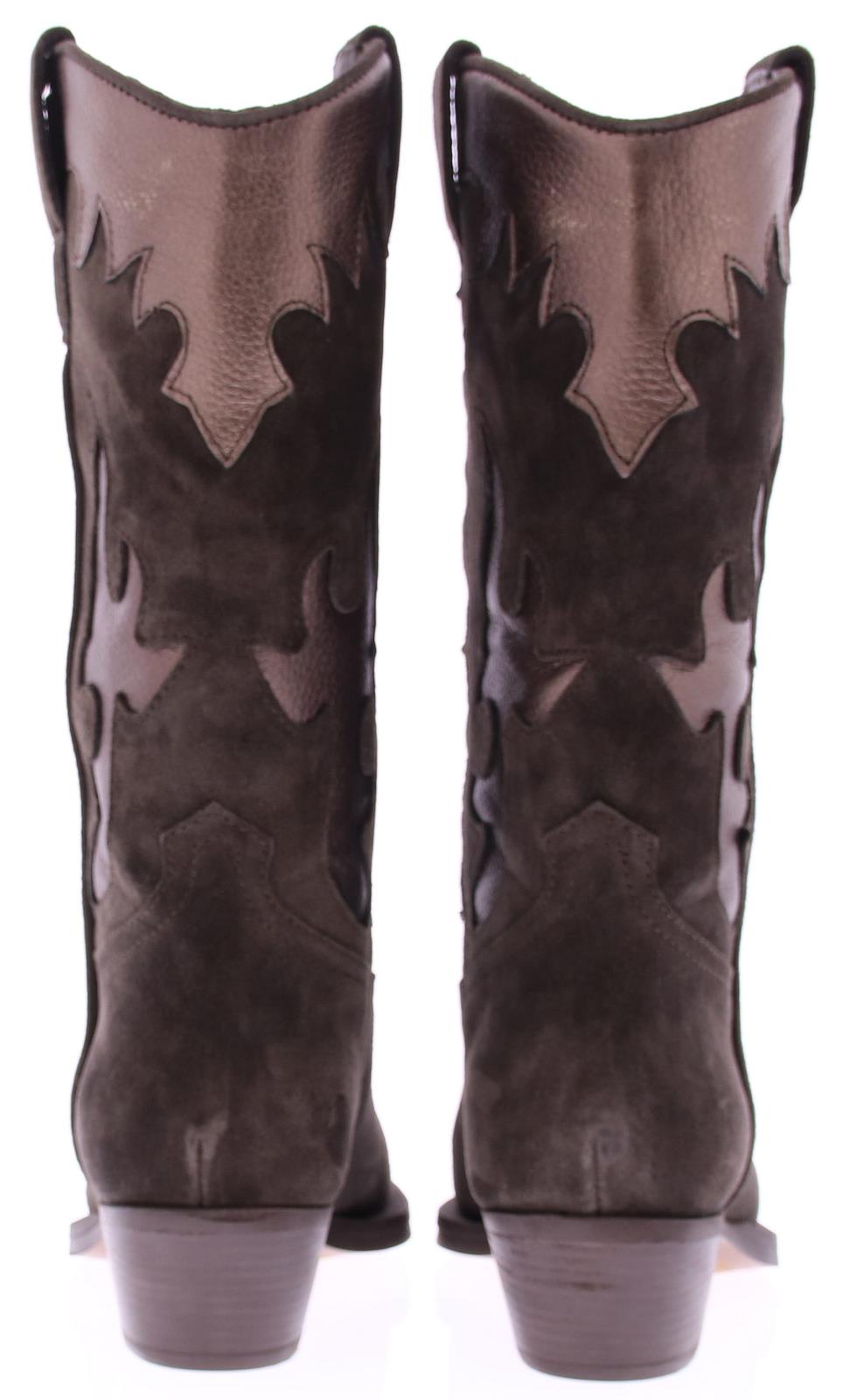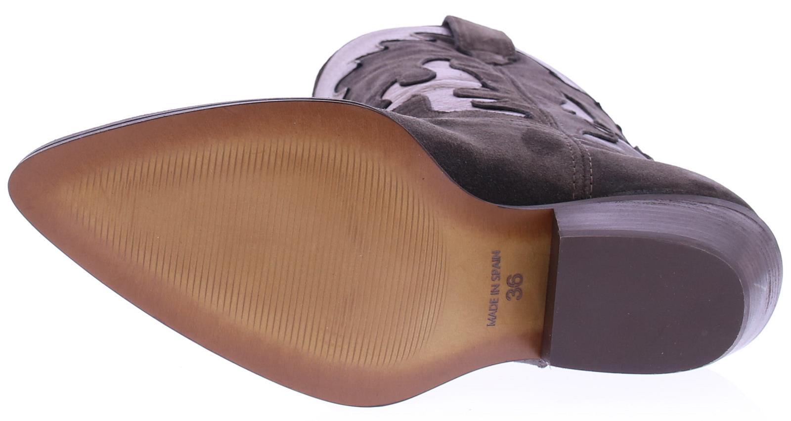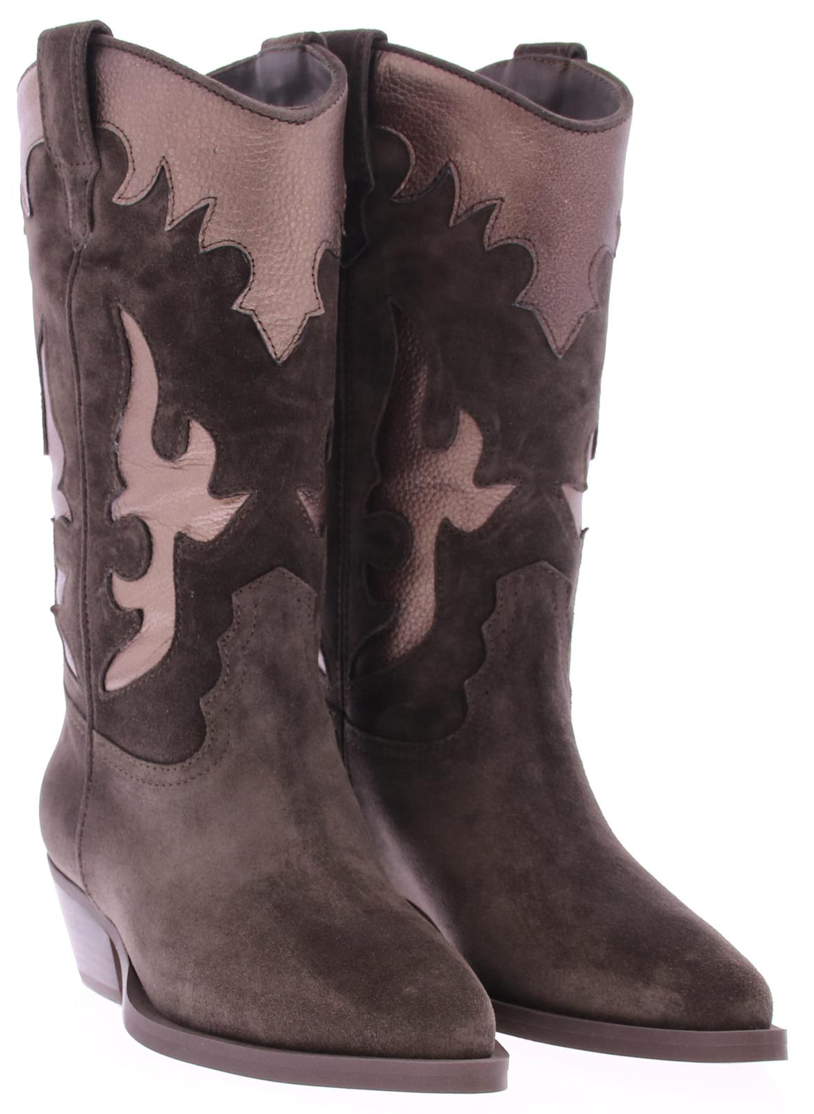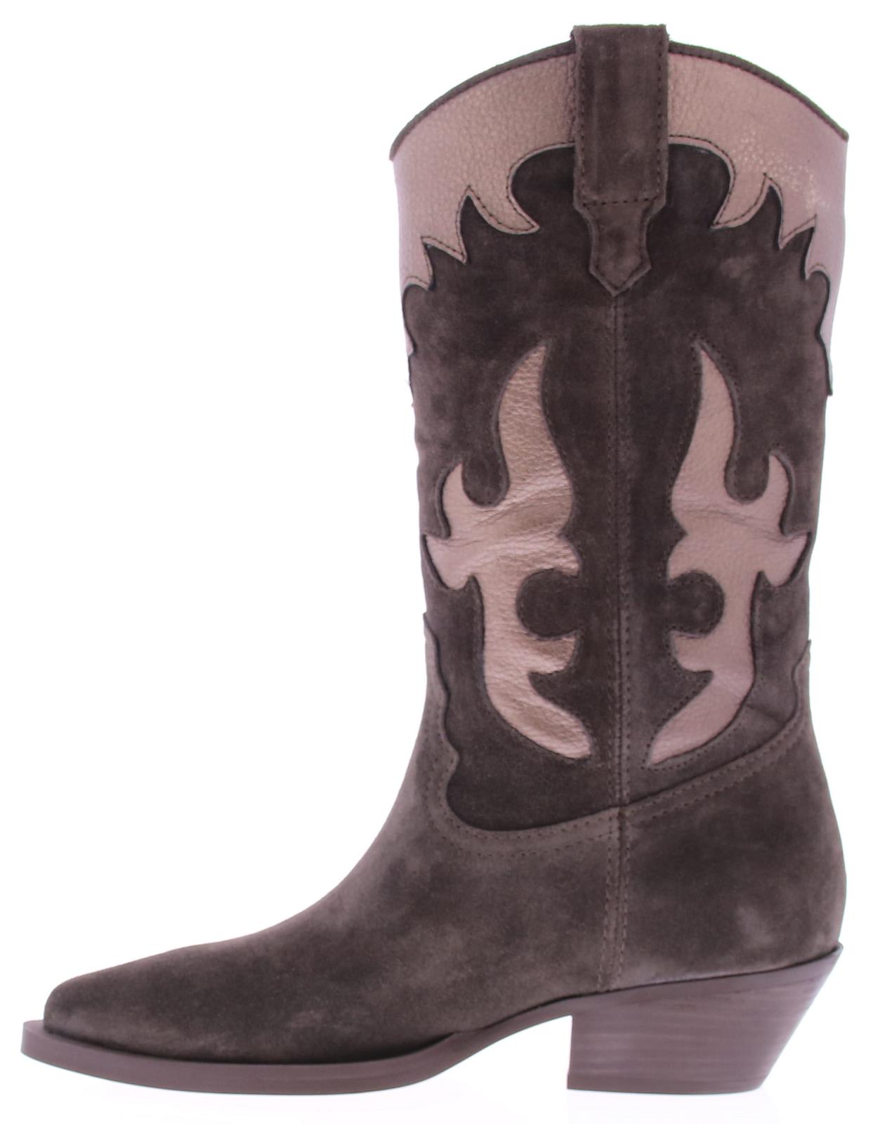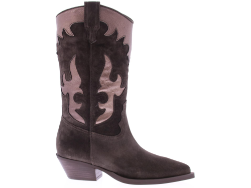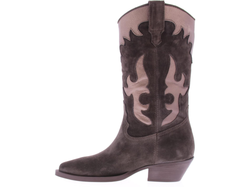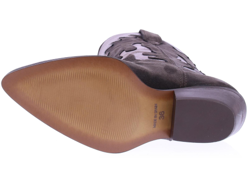 Grijs/ bruin suede dames driekwart laars van Alpe. Deze city western look dameslaars heeft een afgeronde neus , een stabiele westernhak en aantreklussen. Het bovenwerk is uitgevoerd in suede met bronzen inzetten, de binnenkant is deels stof en leer. De trend van dit seizoen, leuk bij een jurkje of een broek!!.