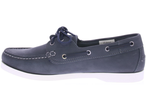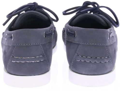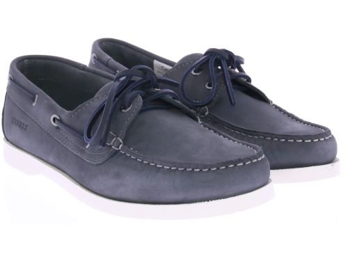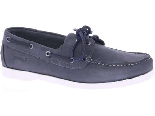 Grijs/blauwe nubuck heren bootschoen van Cypres. De bootschoen is uitgevoerd in grijs/blauw nubuck met een wit stiksel rond de neus. De schoen is ongevoerd en heeft een witte rubberen bootschoen zool.