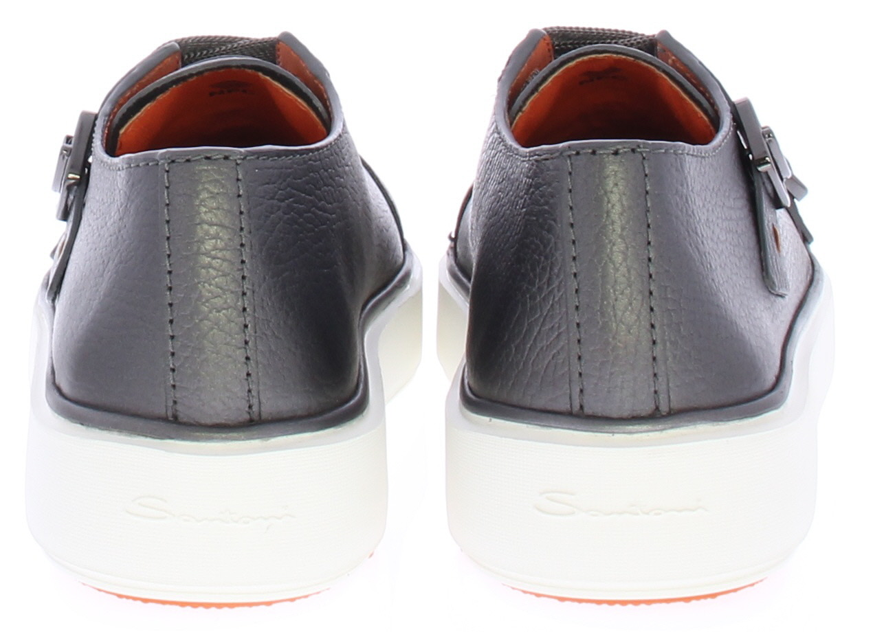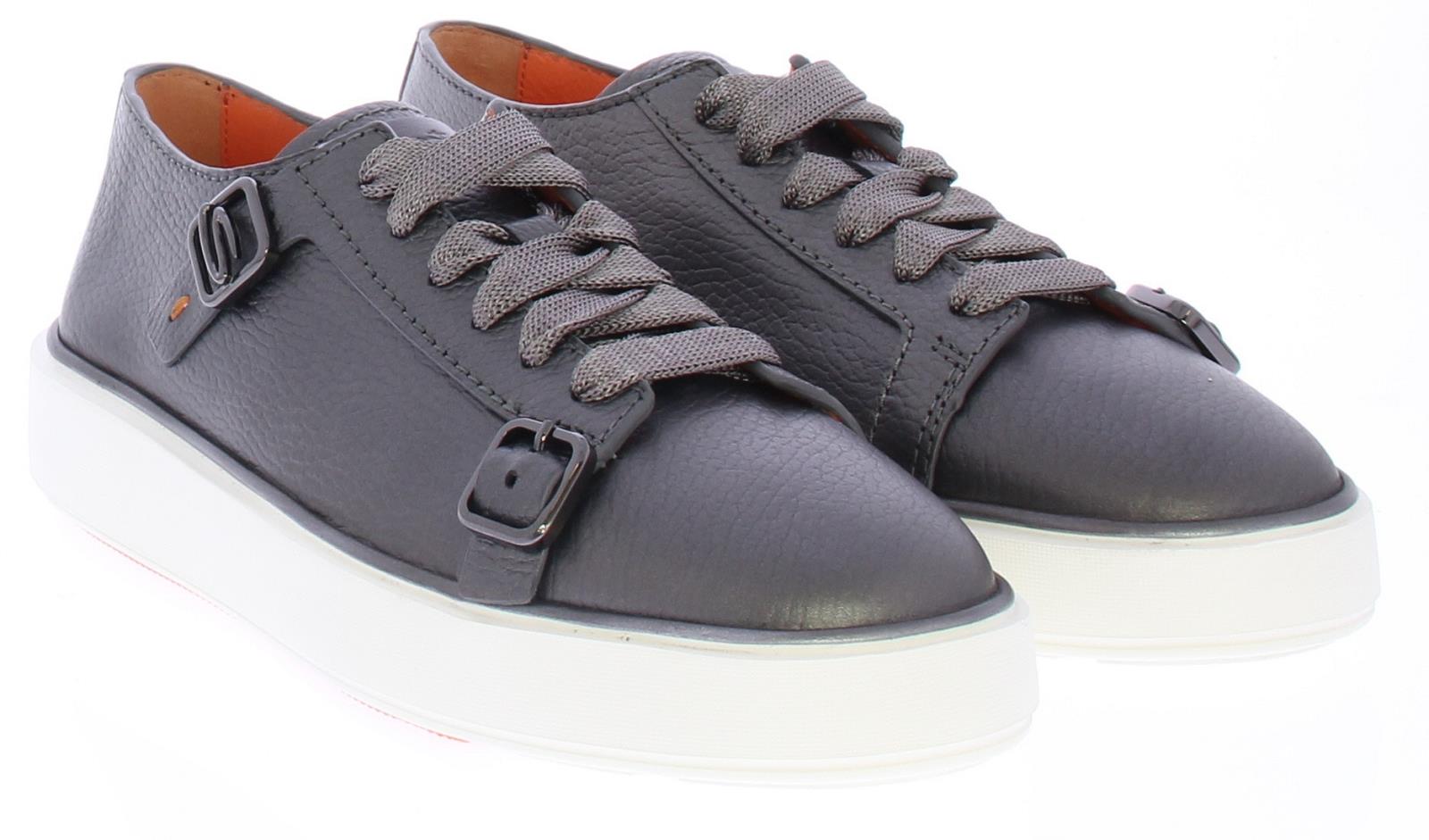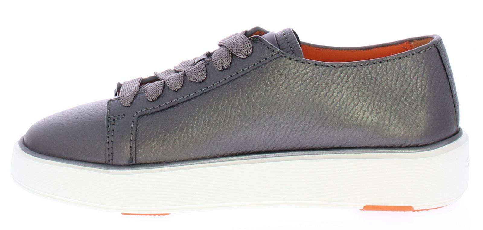 Metallic grijze leren dames sneaker van Santoni. Deze sneaker komt uit de "clean icon" lijn. Het mooie kalfsleer heeft een klein beetje structuur, 2 mat zilveren gespjes waar van de bovenste met een S logo. De sneaker heeft een uitneembaar voetbed.