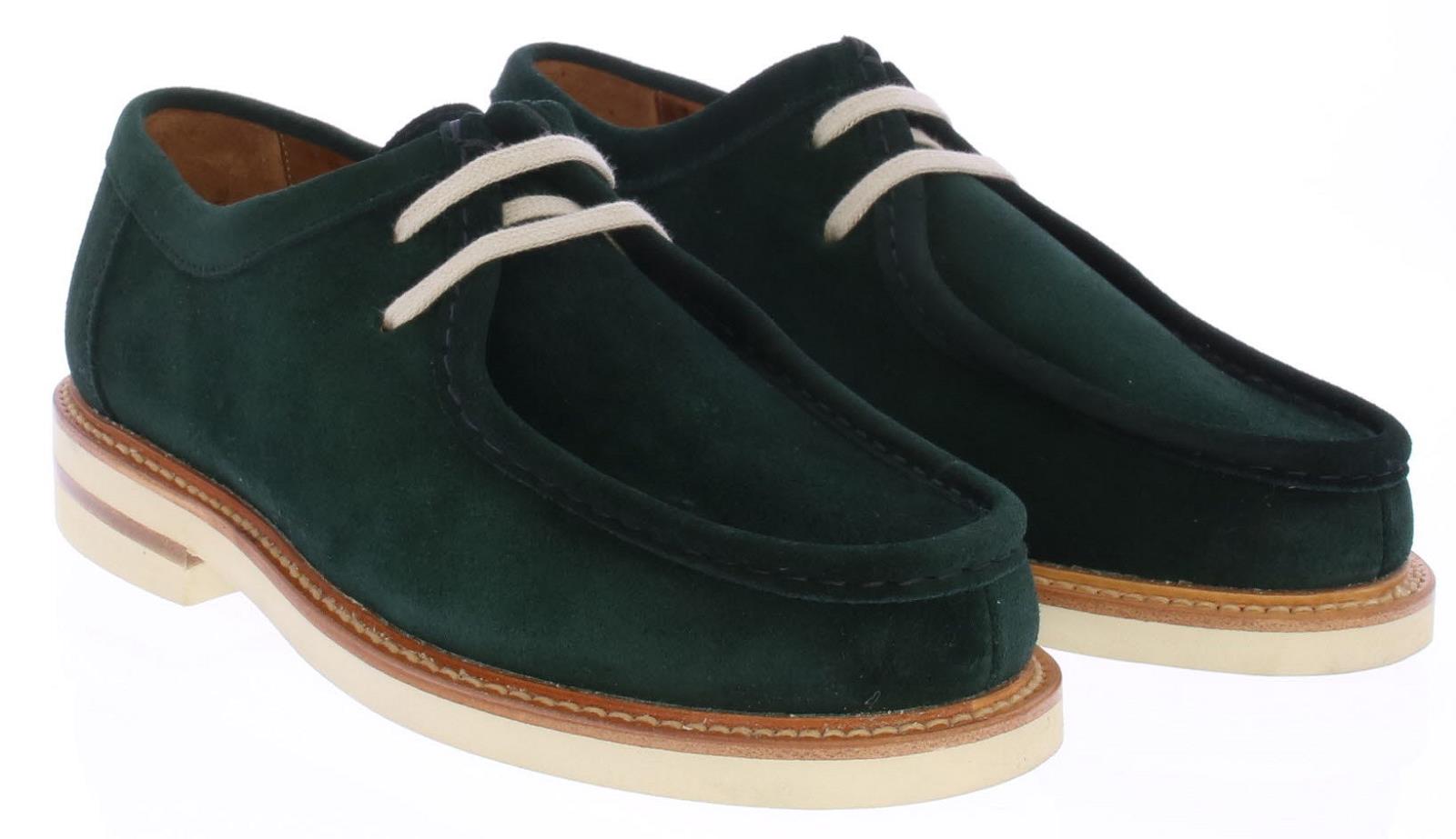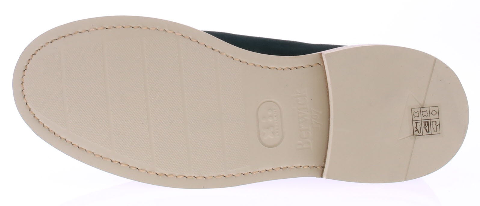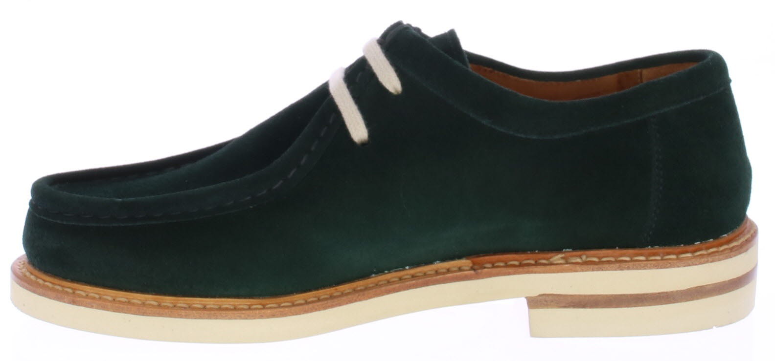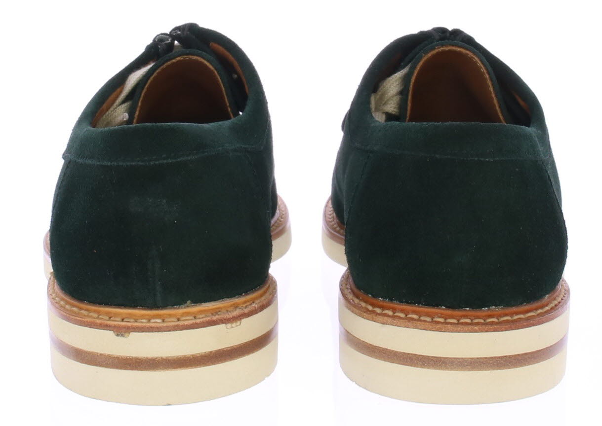 Heren veterschoen van Berwick. De schoen is uitgevoerd in donkergroen suede. De schoen heeft een opgestikte spiegelnaad. De zool heeft een zoolrand met grove handsteek rondom de witte rubberen zool.