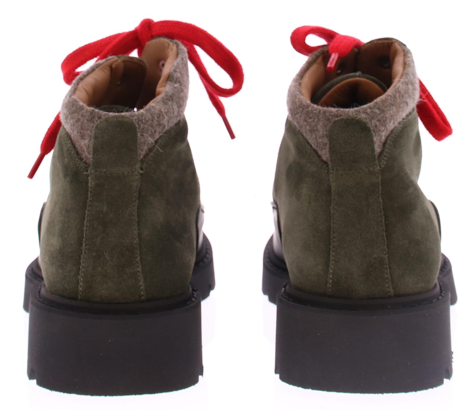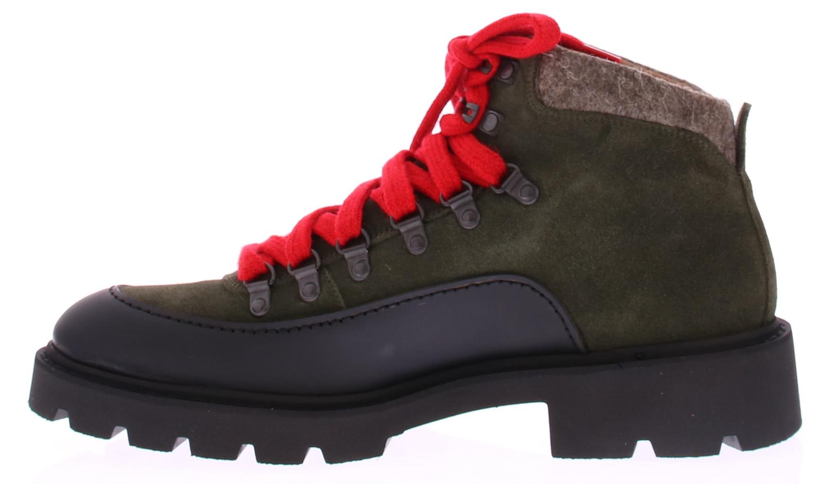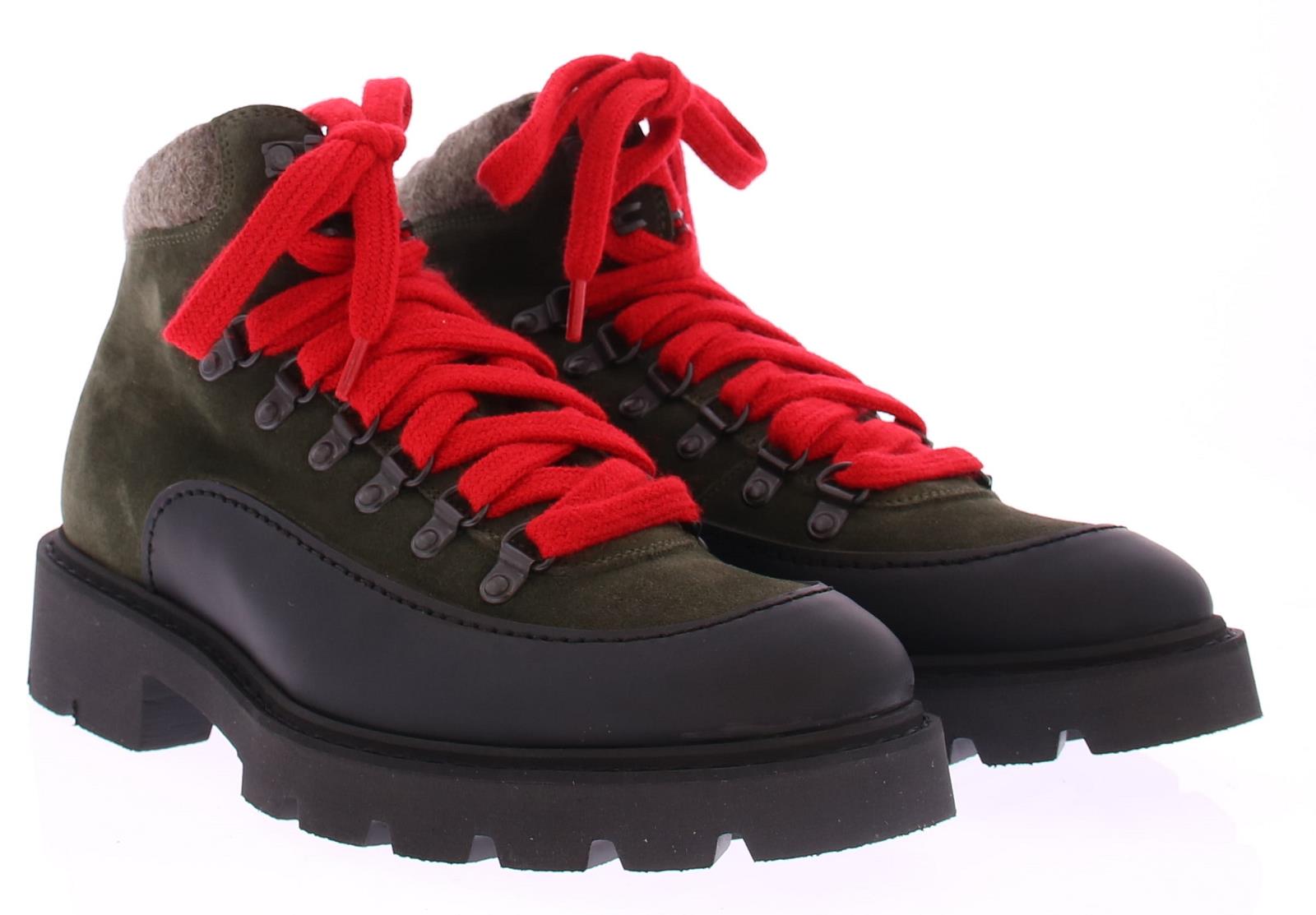 Heren bergboot van Calce. Deze in groen suede uitgevoerde bergschoen met rubber omrand heeft door zijn gekleurde veter en wollen manchet een sportieve modische uitstraling. Daarnaast is dit merk erg goed in pasvorm en heeft al zijn schoenen met mooi kalfsleer gevoerd.