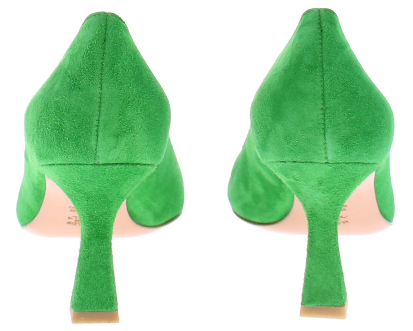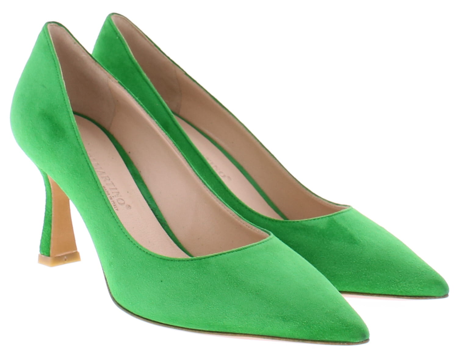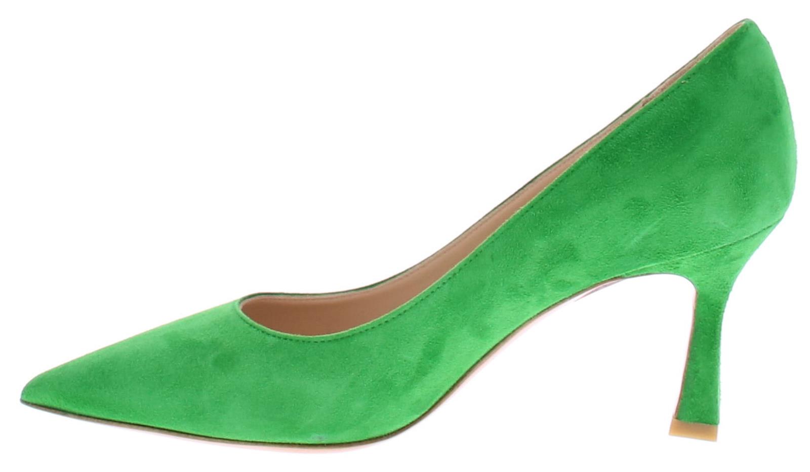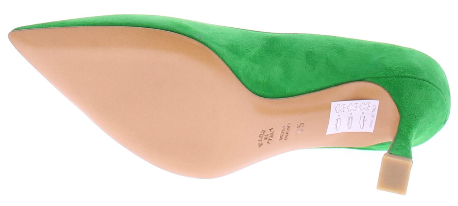 Groen suede dames pump van Enzo di Martino. Deze suede pump heeft een spitse neus en is leer gevoerd. De iets uitlopende hak heeft een hoogte van 7 cm. De zool is geheel van leer.
