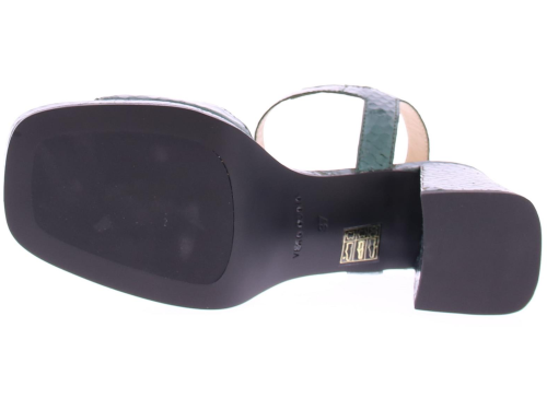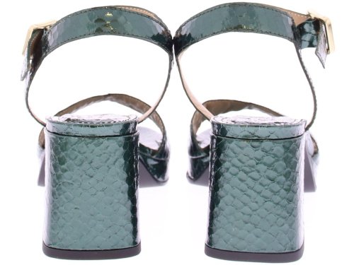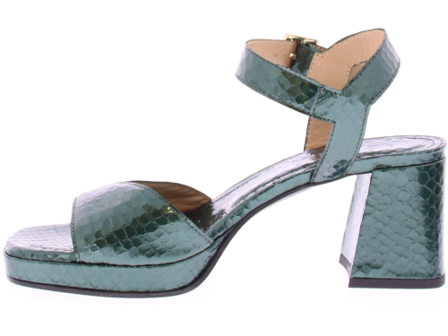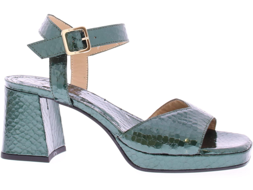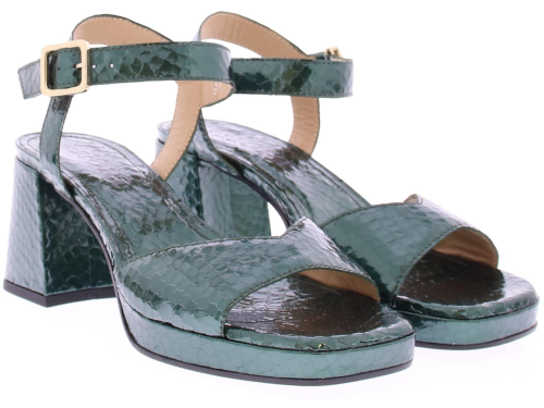 Donkergroen leer met een slangeprint dames sandaal van Gioia. Deze sandaal heeft een brede band over de voet en een enkelband met een zilverkleurig gespje. De plateau zool heeft een hoogte van 2 cm en de hak is 5 cm hoog. Het voetbed is van leer.