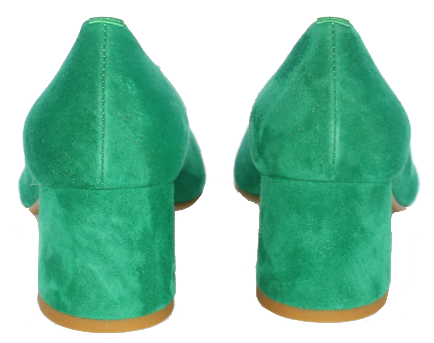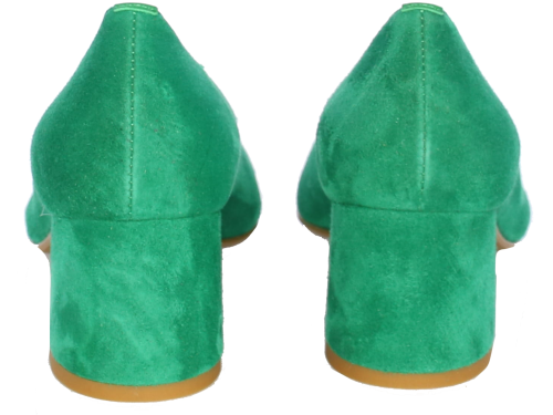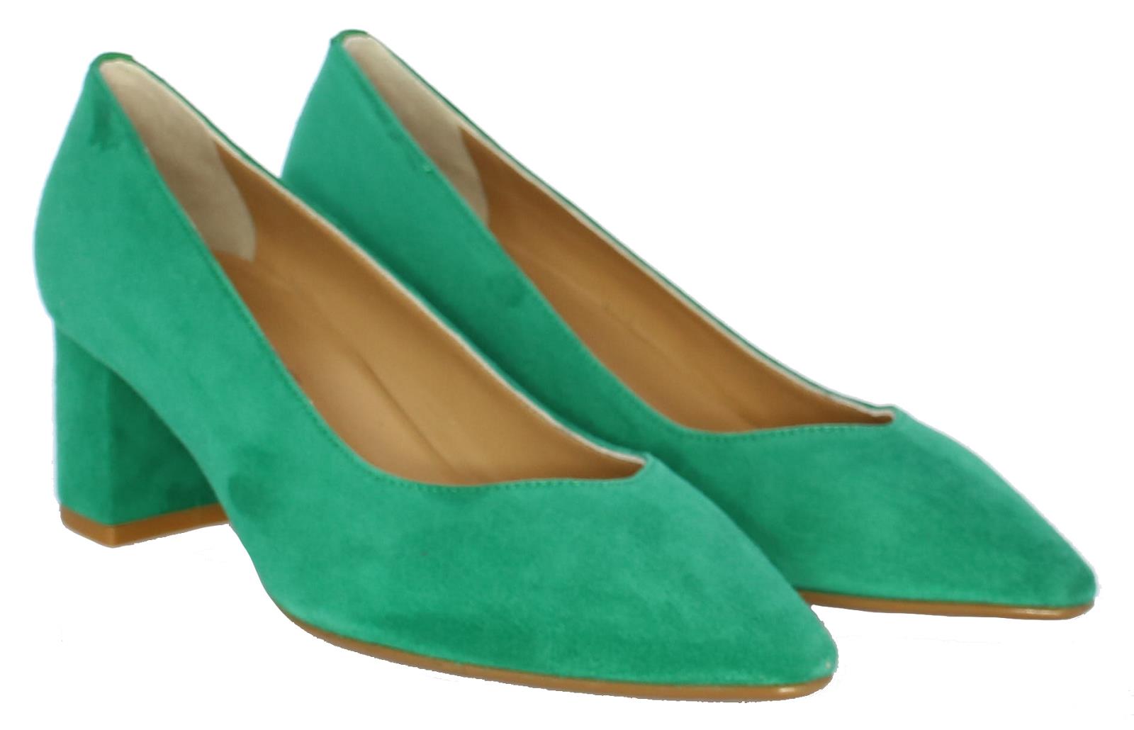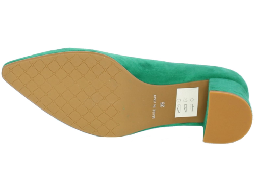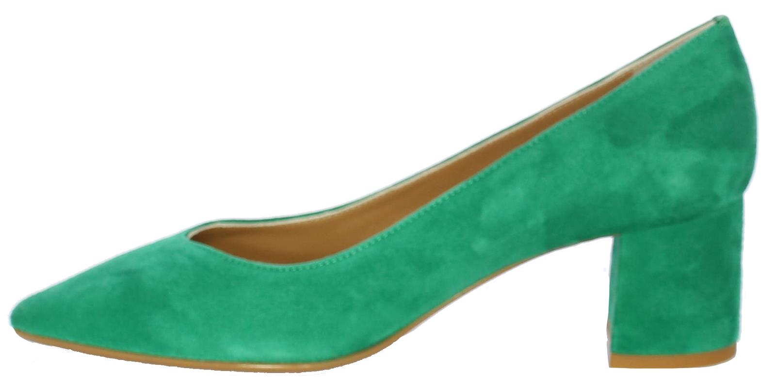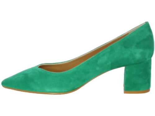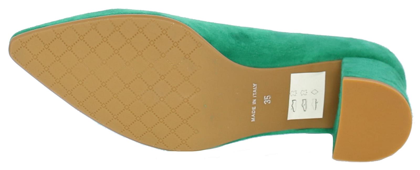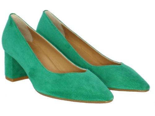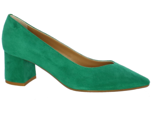 Smaragdgroene suede damespump van Nalini. De beklede hak maar comfortabele hak heeft een hoogte van 4 cm. De V- uitsnijding geeft de pump een elegante uitstraling.