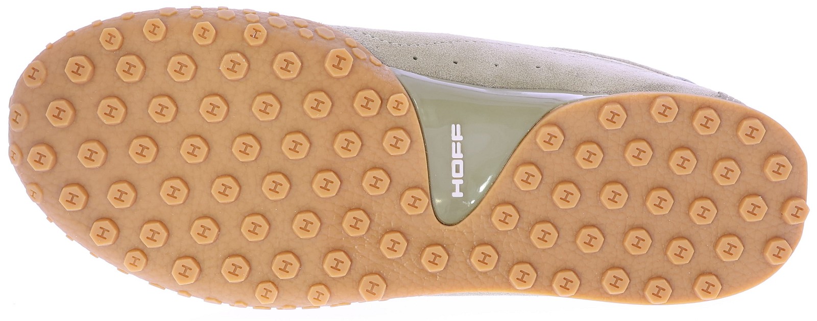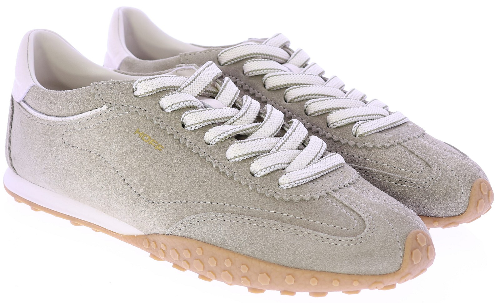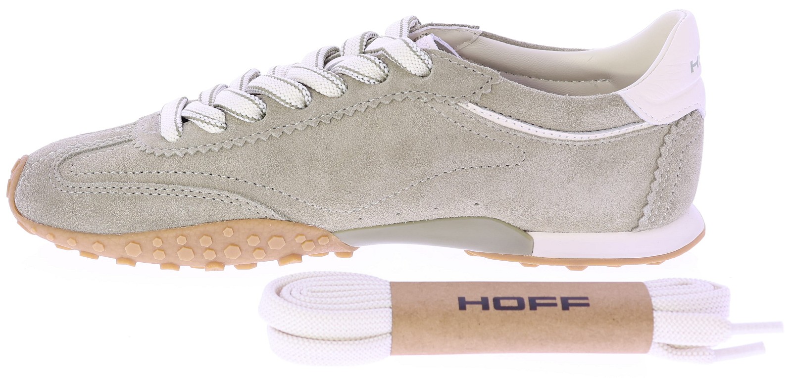 Khaki suède dames sneakers van Hoff, model Bridge FL sage. Deze sneaker is uitgevoerd in suède met subtiele leren details en heeft een sportieve zool met gripvast profiel. Het zachte, uitneembare voetbed biedt optimaal comfort bij dagelijks gebruik. Een veelzijdig model dat moeiteloos combineerbaar is met elke garderobe. Ontdek ook de andere dames sneakers van Hoff bij Klijsen.