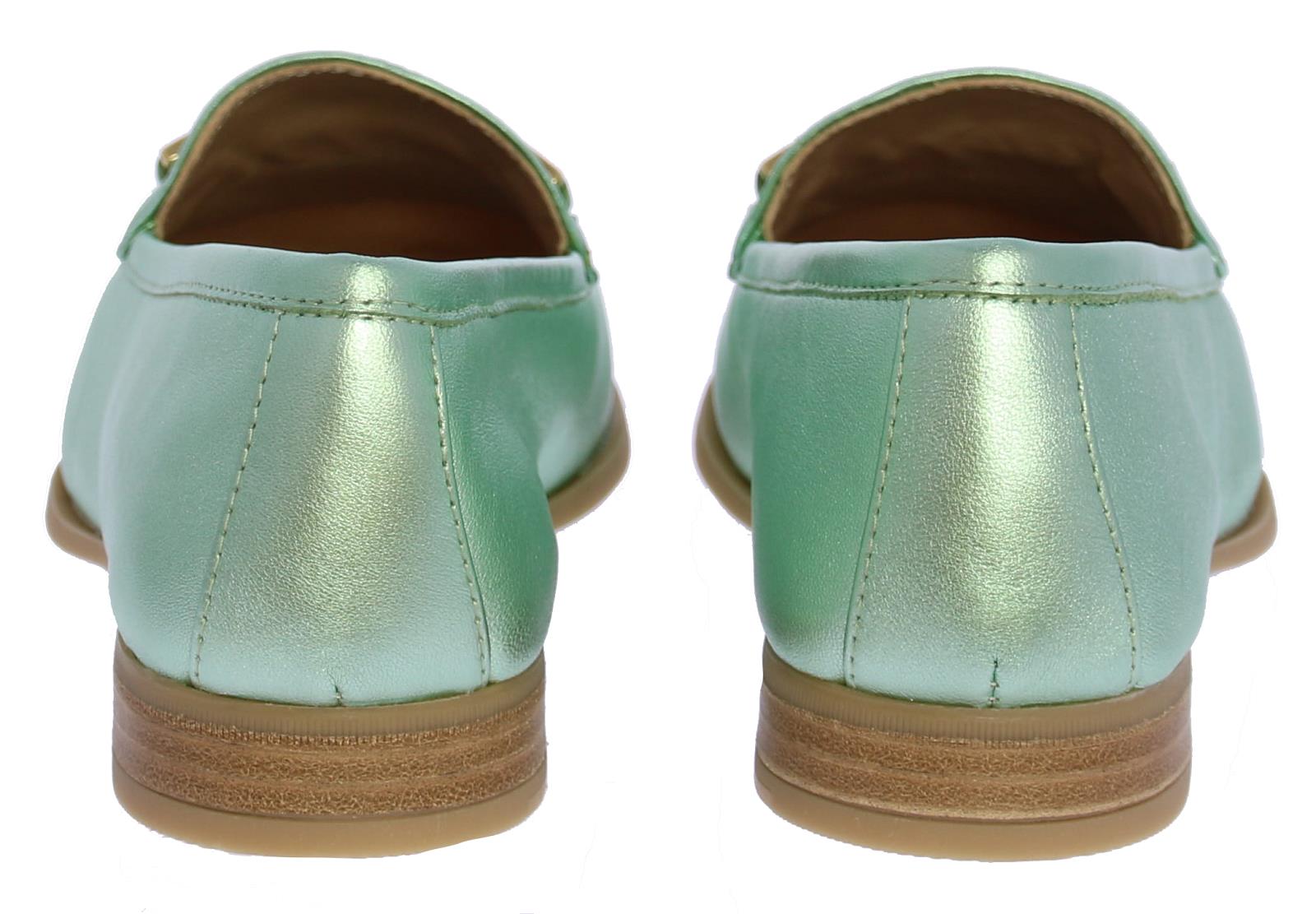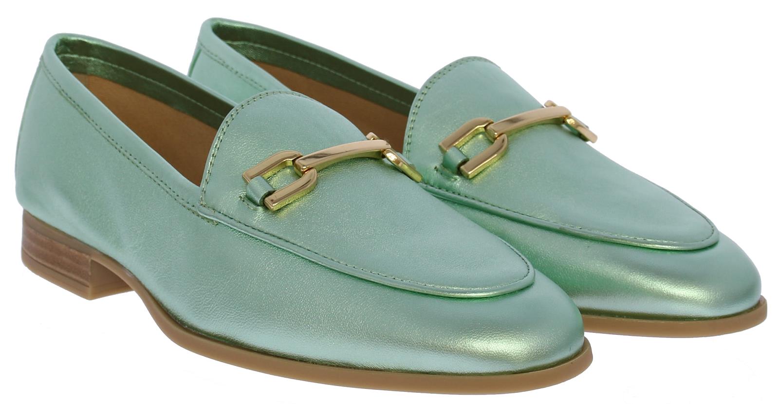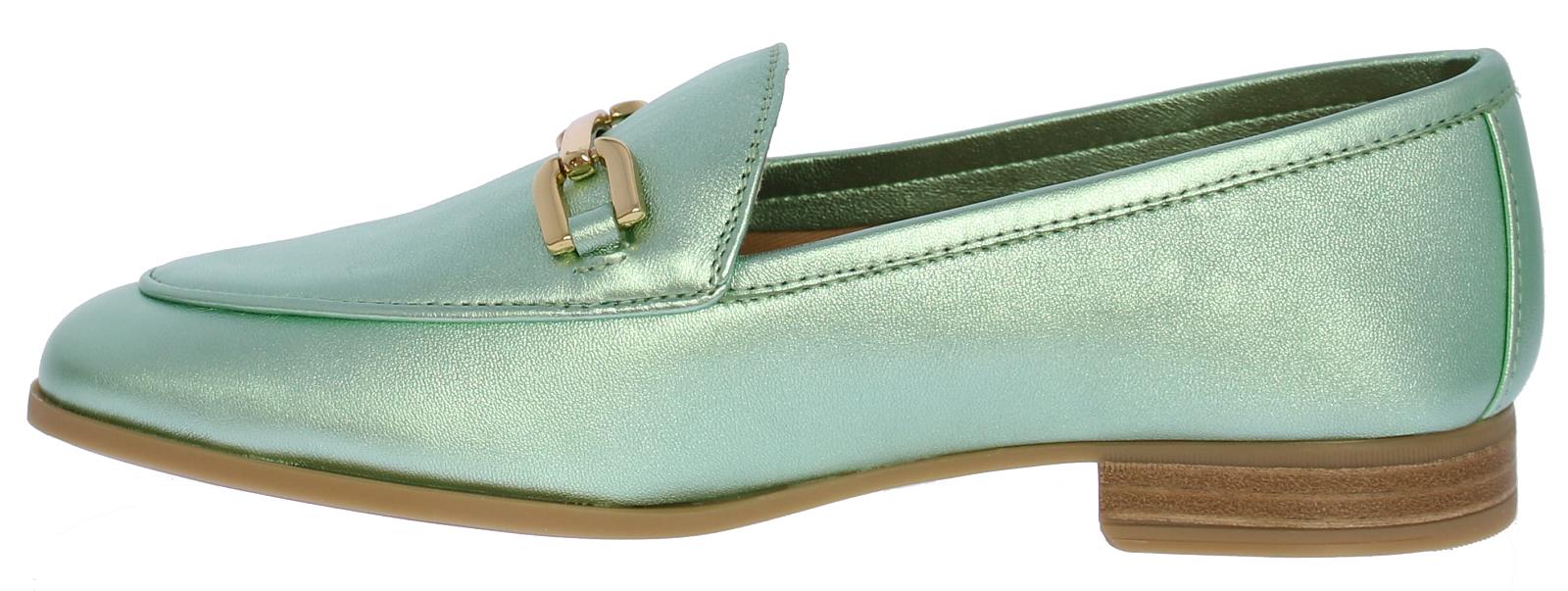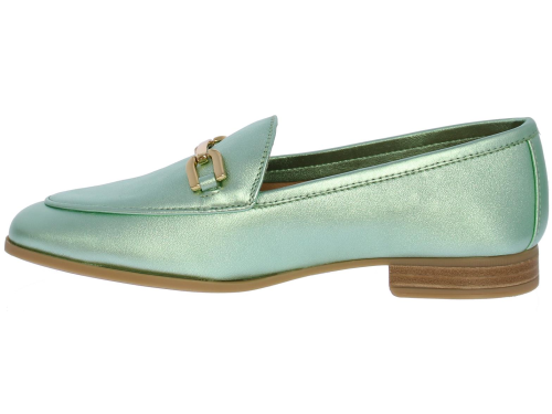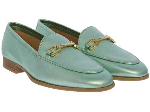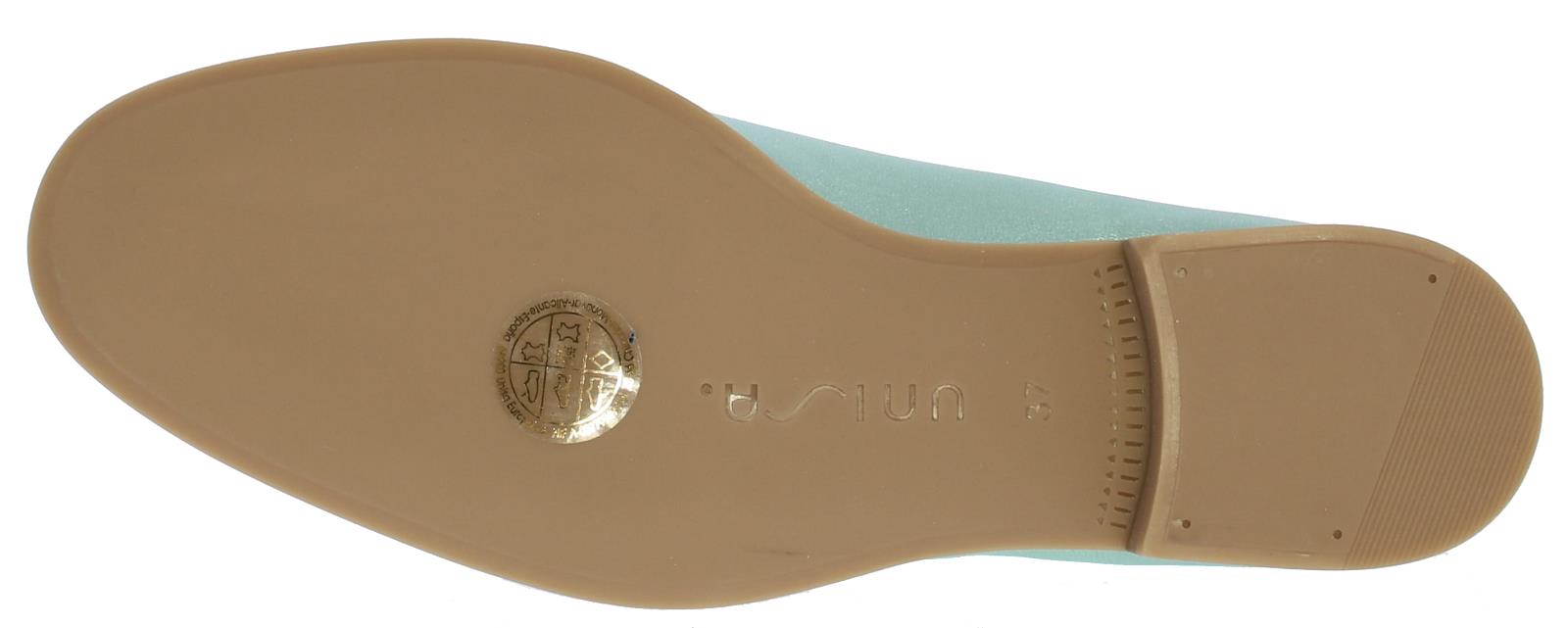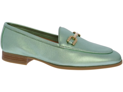 Mintgroene metallic leren dames instapper van Unisa. De instapper heeft een decoratieve goudkleurige bit op de wreef. Dankzij de zool van glad, maar gripvast rubber en het hakje met een hakhoogte van 1,5 centimeter loopt deze slanke loafer heerlijk comfortabel. Draag 'm bij een basic outfit en laat jouw loafers de show stelen!