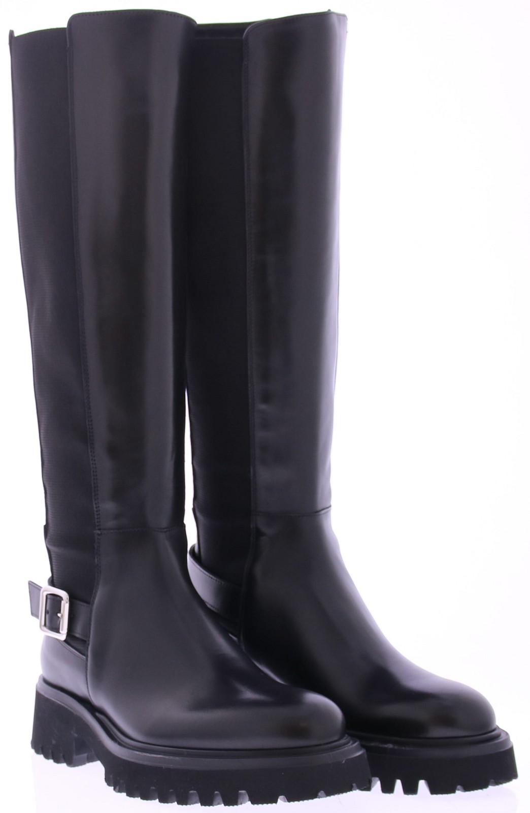 Luxe zwarte hoge zwarte leren dames laars van Rotta. Artikel WOODROW RANCH is een stoerdere lange laars op een sportief onderwerk. Aan de buitenkant zit een elastieke baan en aan de binnenkant de rits van boven naar beneden. Bij de enkel zit als garnering een leren bandje met zilverkleurige gesp.