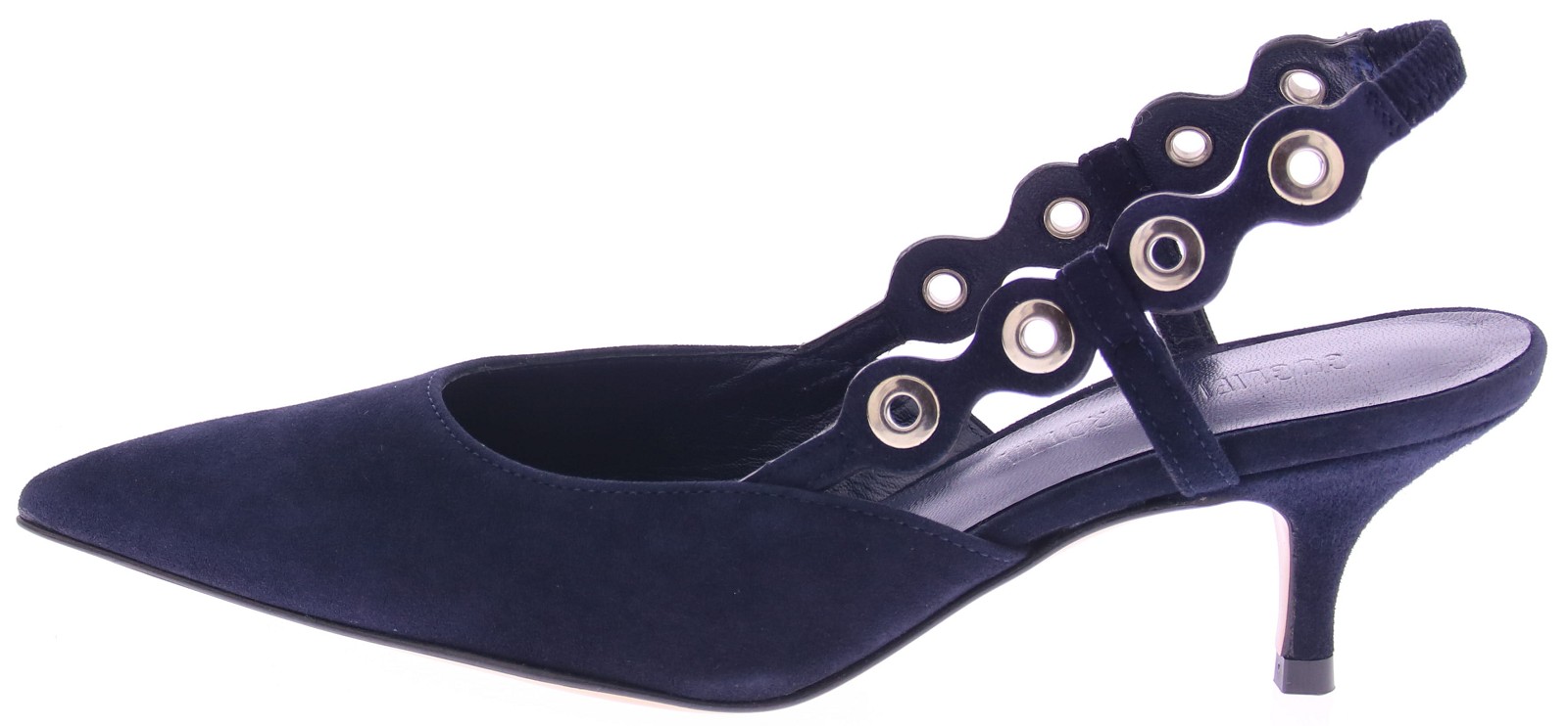 Donkerblauw suède slingback pumps van Guglielmo Rotta, model Alter. Deze elegante dames pumps hebben een spitse neus en een verfijnde hak van 6 cm. Het zachte suède geeft het model een luxe uitstraling, terwijl de decoratieve ringetjes op de band zorgen voor een modieus accent. Dankzij het elastiek in de hiel sluit de pump comfortabel aan en beweegt hij prettig mee tijdens het lopen. Ontdek ook de andere dames pumps van Guglielmo Rotta bij Klijsen.